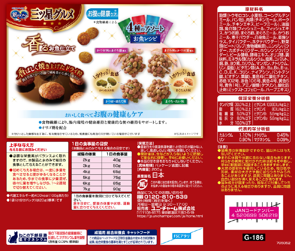 穀類(トウモロコシ、小麦粉、コーングルテンミール、パン粉)、肉類(チキンミール、ポークミール、チキンエキス、ビーフミール)、油脂類、魚介類(フィッシュミール、フィッシュエキス、かつお節、まぐろ節、まぐろミール、かつおミール、煮干パウダー、白身魚ミール、乾燥シラス、タイパウダー、ホタテパウダー)、野菜類(ビートパルプ(食物繊維源))、ニンジンパウダー、カボチャパウダー、ホウレンソウパウダー)、ビール酵母、酵母エキス、オリゴ糖、調味料、ミネラル類(カルシウム、塩素、コバルト、銅、鉄、ヨウ素、カリウム、マンガン、ナトリウム、リン、亜鉛)、ビタミン類(A、B1、B2、B6、B12、C、D、E、K、コリン、ナイアシン、パントテン酸、ビオチン、葉酸)、着色料(二酸化チタン、赤色102号、黄色4号、黄色5号、青色1号)、アミノ酸類(タウリン)、酸化防止剤(ミックストコフェロール、ハーブエキス)●保証成分:たんぱく質30.0%以上、脂質16.0%以上、粗繊維5.0%以下、粗灰分8.0%以下、水分10.0%以下●エネルギー:約400kcal/100g