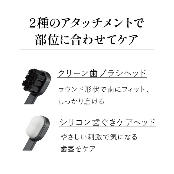 歯茎ケア+表情筋ケアが可能。 シリコン歯茎ケアヘッド(歯茎ケア・表情筋ケア用):交換目安約3〜6か月 となります。