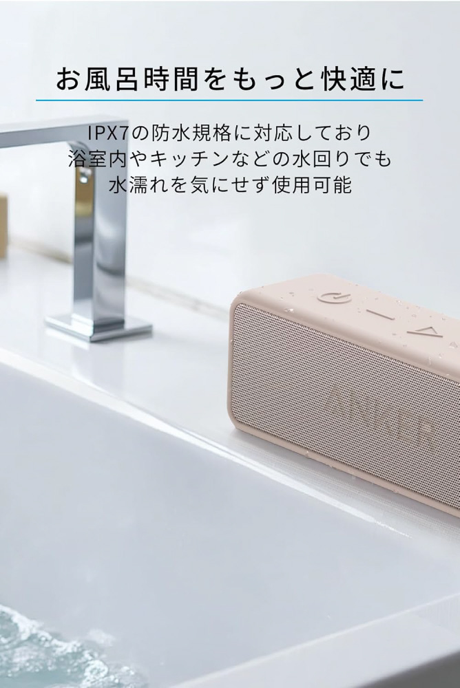 IPX7の防水規格対応なので、浴室内やキッチンなどの水回りでも水濡れを心配することなく音楽を楽しむことができます。