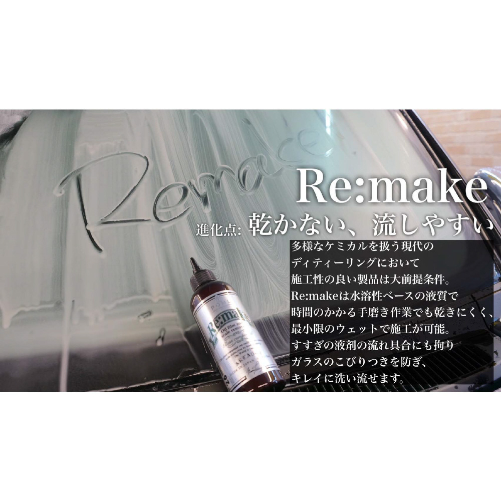 Re:makeは水溶性ベースの液質で時間のかかる手磨き作業でも乾きにくく最小限の水分でウェット施工が可能です。