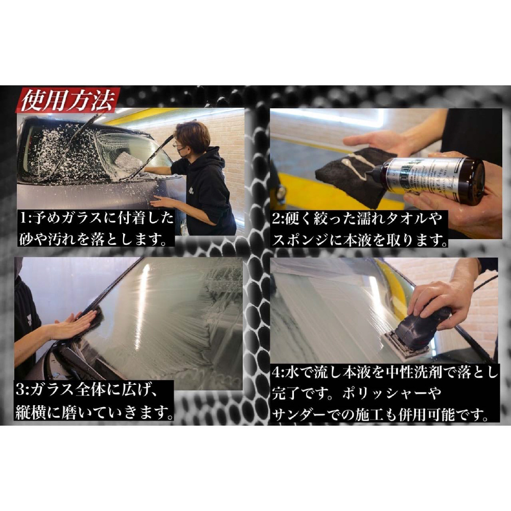 1.予めガラスに付着した砂や汚れを洗車で落としてください。