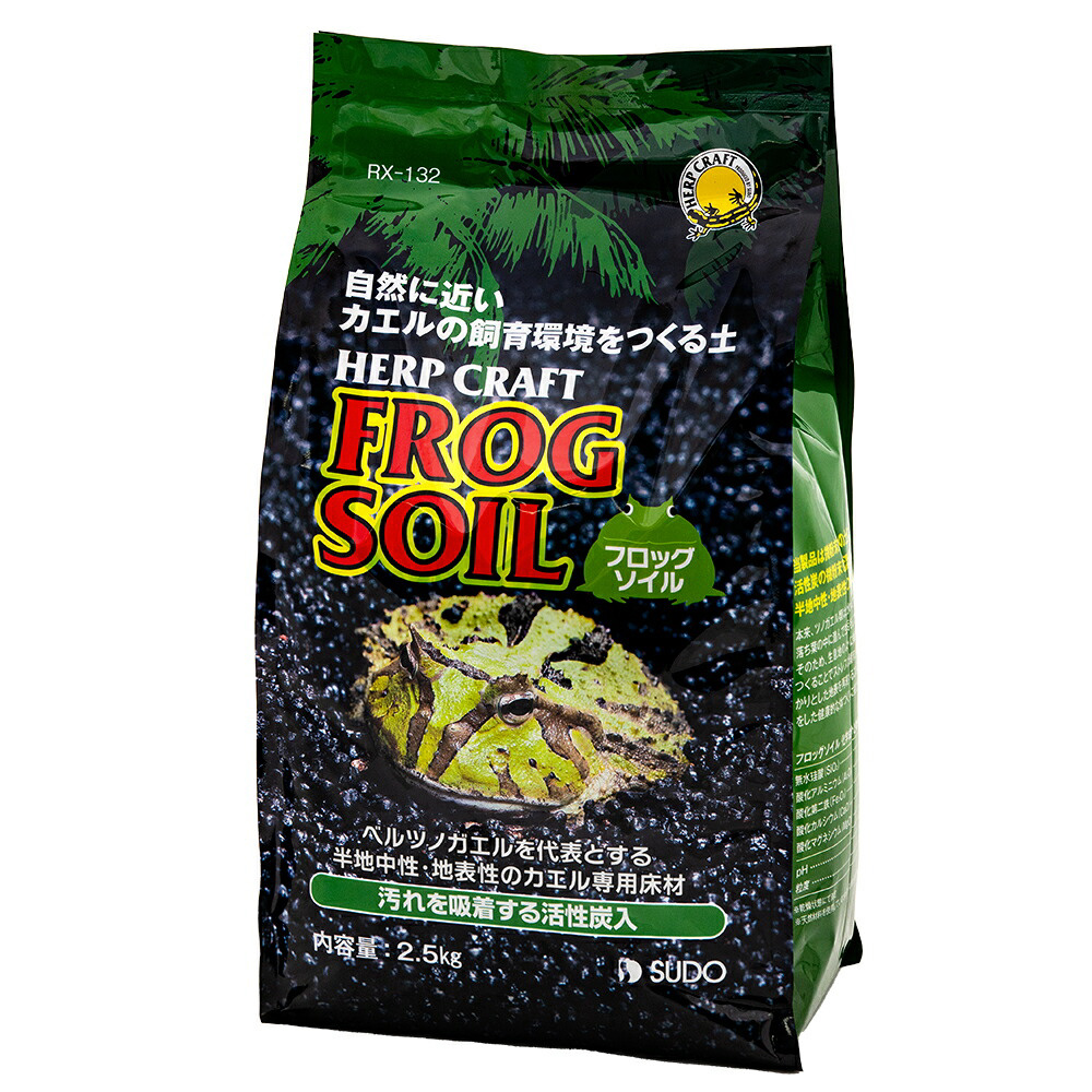●本来、ツノガエル類は水中ではなく湿った土や落ち葉の中に潜んで生活をしているため、フロッグソイルを潜れる深さに敷きつめることで、自然に近い飼育環境をつくることが出来ます。