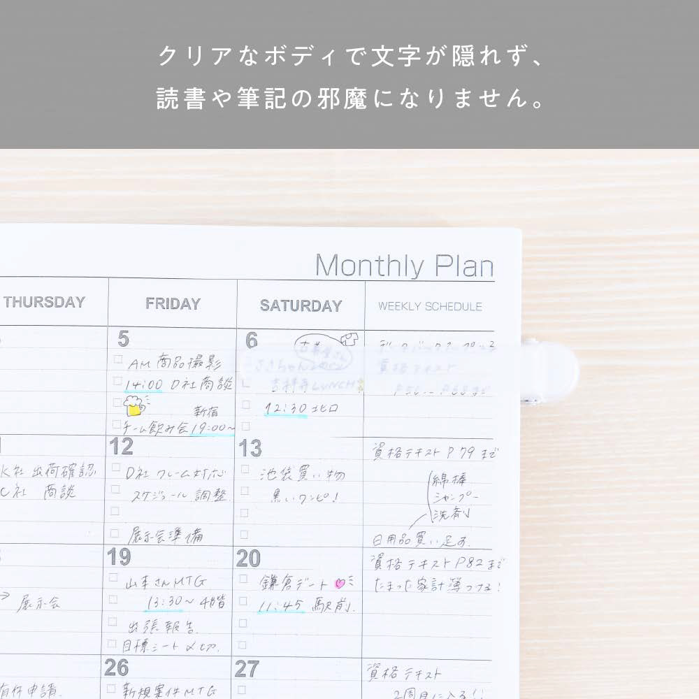 ページをめくっても、しおり部分が自動で追従して開いたページをしっかりキープするので、読みかけのページを見失いません。クリアなボディで文字が隠れず、読書や筆記の邪魔になりません。クリップ型で、表紙に挟んで仕様するので、なくす心配もありません。