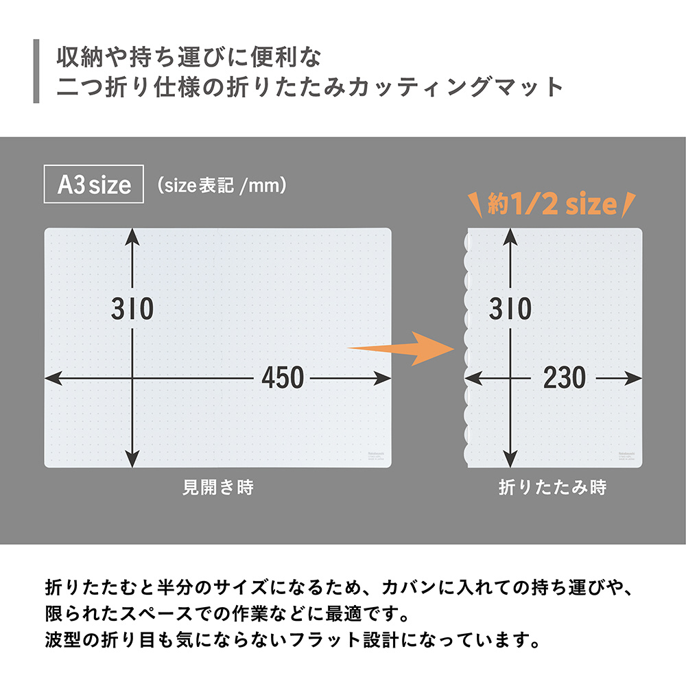 「折りたたみカッティングマット+シリーズ」は、本体を半分に折りたためる二つ折り仕様のカッティングマットです。折りたためることで、使わないときは収納しやすく、作業スペースが確保できないときは省スペースでコンパクトに使うことができます。
