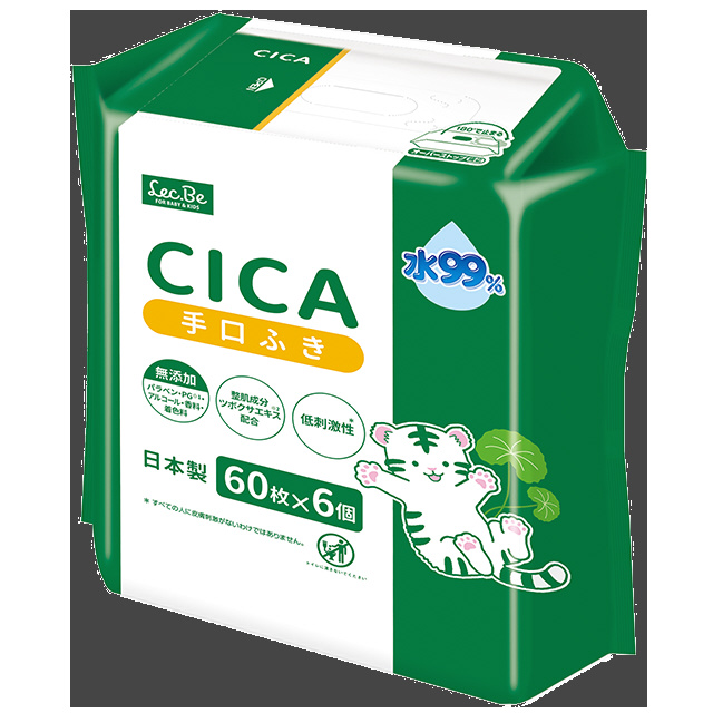 整肌成分ツボクサエキス(CICA)配合のウェットティッシュです。無添加(パラベン、PG、アルコール、香料、着色料)。低刺激性(すべての人に皮膚刺激がないわけではありません)。