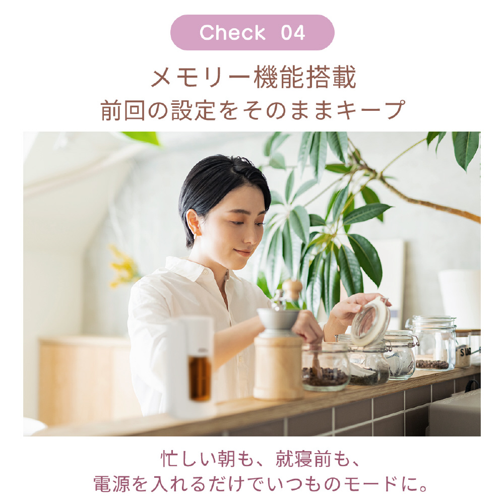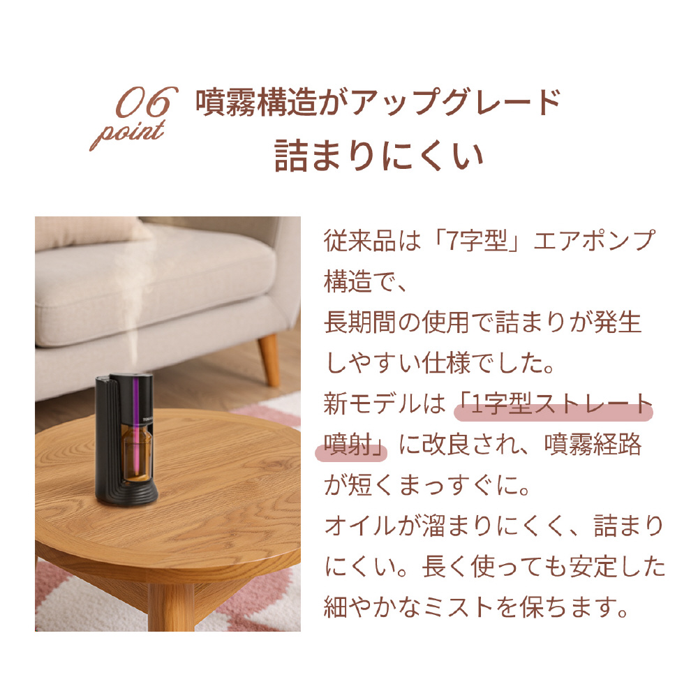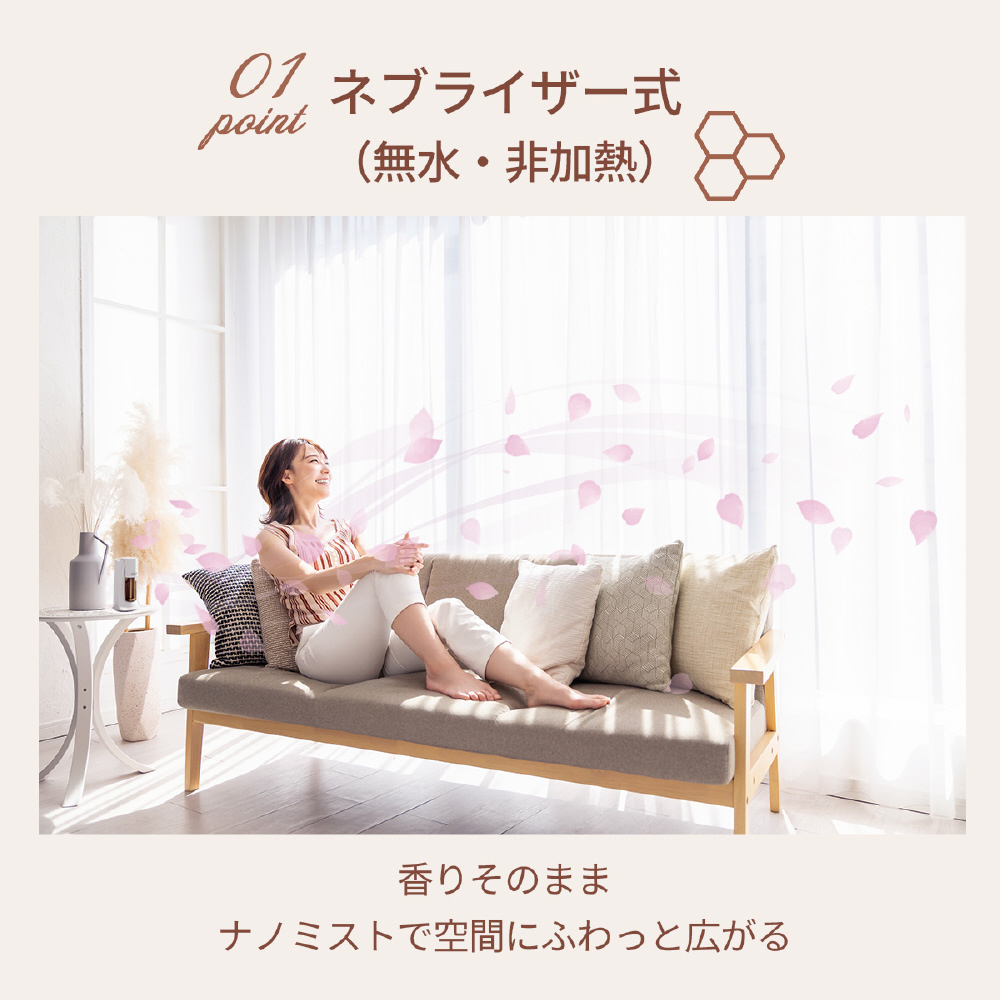 精油をナノミスト化し、加熱せずそのまま噴霧。水を使わないためカビや雑菌の繁殖リスクが少なく衛生的で、お手入れも簡単です。梅雨の時期でも湿気を気にせず、精油本来の濃厚な香りが瞬時に空間へ広がります。