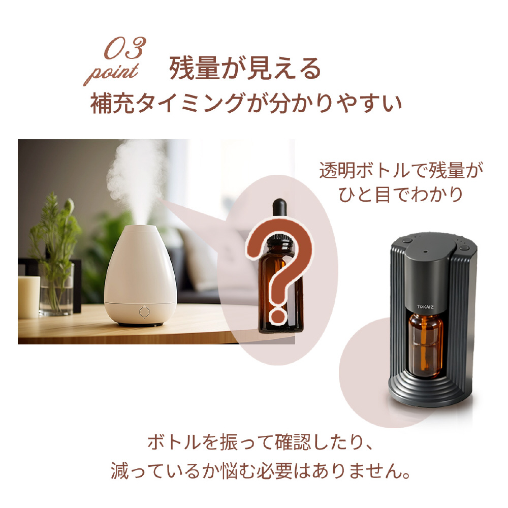 本体のスリットからオイル残量がひと目で分かり、補充タイミングを逃しにくく空運転も防止。付属の20ml瓶はもちろん、市販の10ml/20ml精油瓶をそのままノズルに取り付けて使えるので、移し替え不要で手間を省けます。