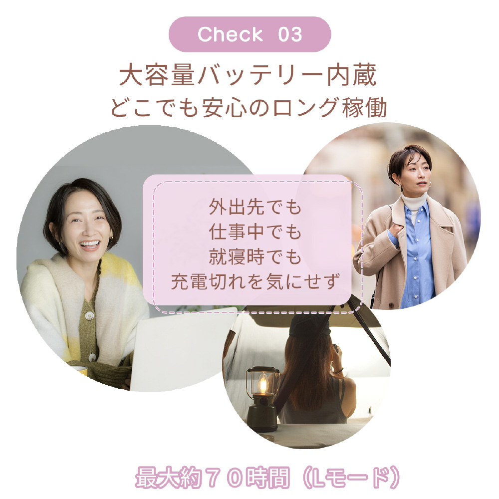 2000mAhバッテリー内蔵で、約4時間の満充電から最大75時間(Lモード時)使用可能。寝室・リビング・オフィスはもちろん、コンセントのない車内や旅行先でも、自由に持ち運んで香りを楽しめます。