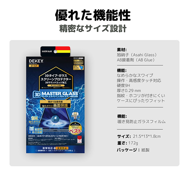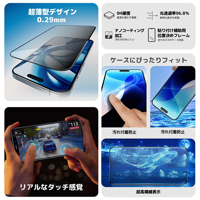 高透明度96.8%、超薄型0.29mmの旭硝子製強化ガラスフィルム。9H硬度で画面をしっかり保護し、滑らかな操作感を実現。