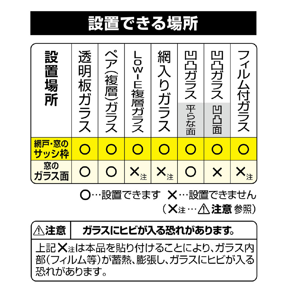 仕様3 注意事項:※一部貼り付けできない窓ガラスがありますので、【設置できる場所】をご確認ください