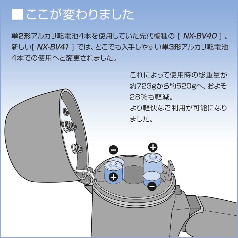 長さ約22cm、直径約14cm(取っ手・突起部除く)、重さ:約520g(乾電池含む)