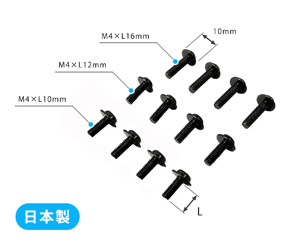 M4×10mm/M4×12mm/M4×16mmの3種各4本のセットでモニター仕様や取付環境に合わせて選択ができます。