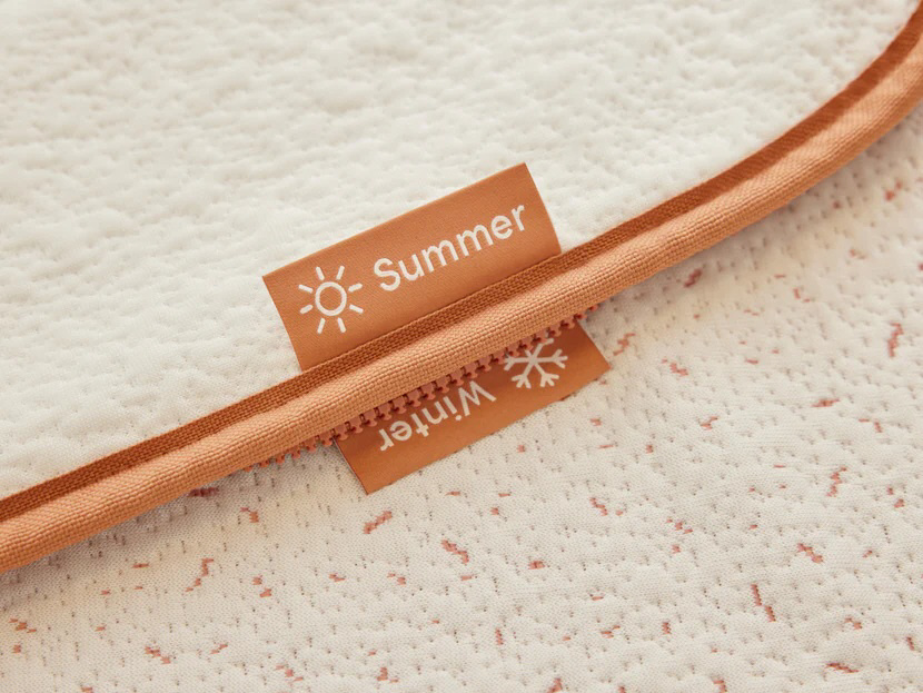 リバーシブル仕様の夏冬2WAYカバーは、ファスナーを開いてひっくり返すだけで切り替え可能。