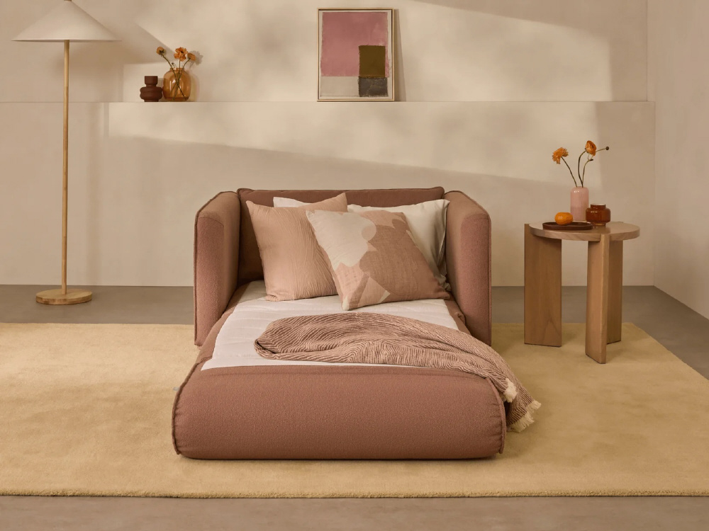進化したCUSHYは、背もたれと座面を倒せば5秒でフルサイズのベッドに切り替え可能。
