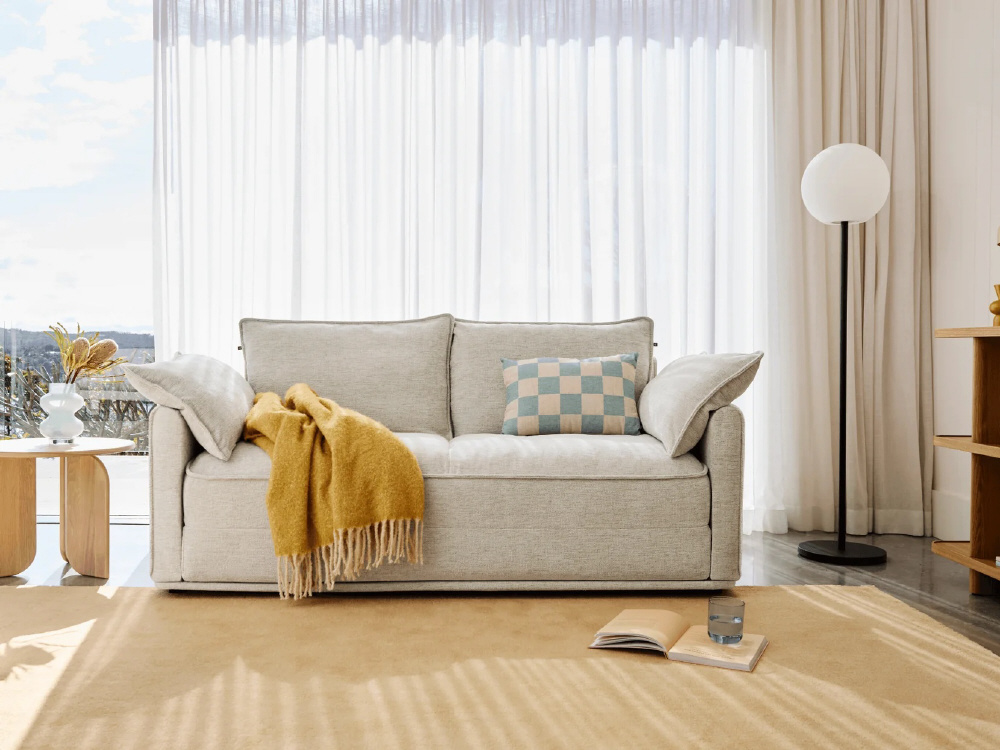 ひとりでも、ふたりでも心地いいCUSHYは、寝転んでも座っても、1日中快適。トッパーにはクラウドセル(R)を採用し、マットレスのような寝心地を実現しました。