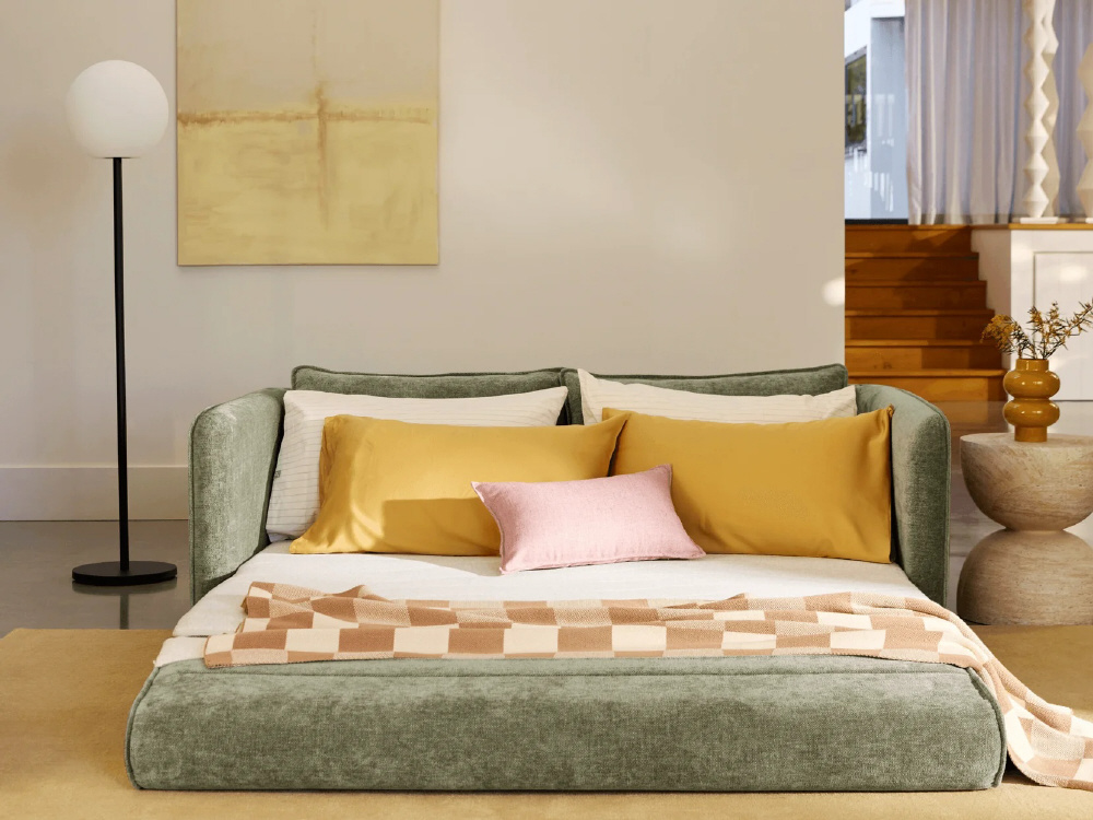 進化したCUSHYは、背もたれと座面を倒せば5秒でフルサイズのベッドに切り替え可能。