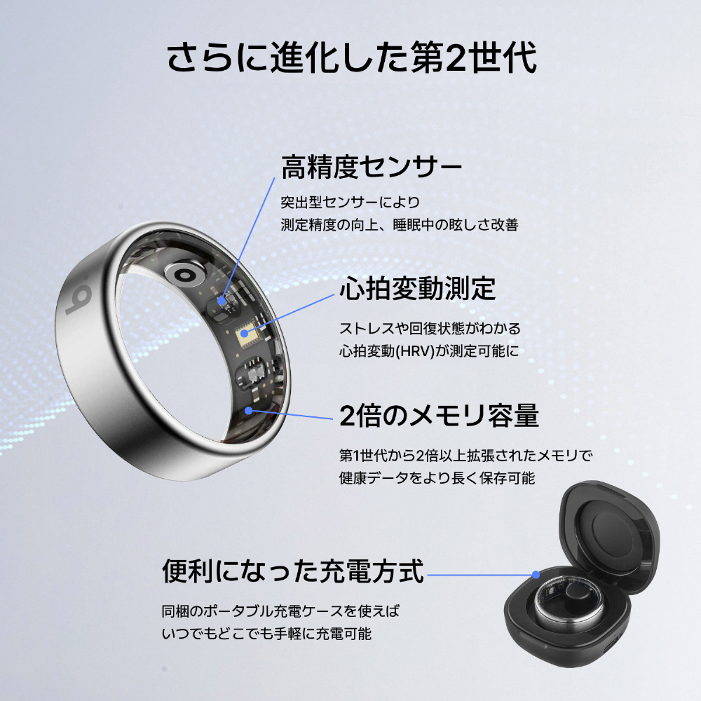 1、光血流センサー、加速度センサーなど精密なセンサーを搭載。小さなリングに搭載された精密なセンサーが、動作からバイタルサインまで指先で繊細に感知します。