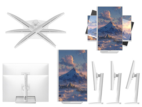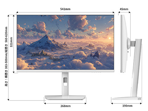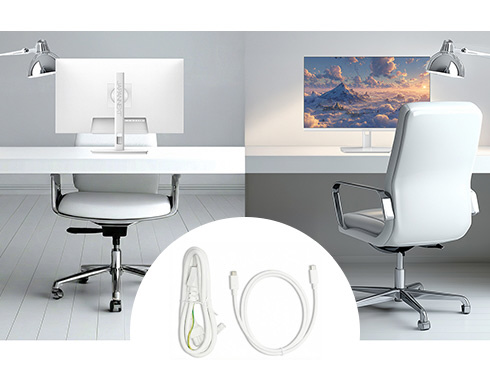 ■本体カラーにホワイトを採用。モニターベゼルやスタンドも白となっており、爽やかでおしゃれな空間を演出したい場合や、デバイスを白で統一したい場合に最適です。さらに、付属の電源アダプター、ケーブル類にもホワイトカラーを採用。全体が白基調に統一された部屋や医療機関などでの使用にも最適です。