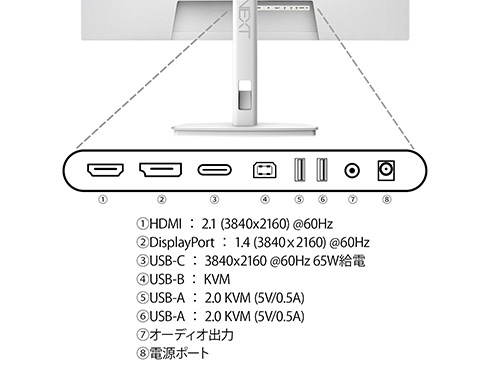 ■インターフェイスは、HDMI2.1 x1 (60Hz)、DisplayPort1.4 x1 (60Hz)とUSB-C x1 (60Hz/最大65W給電)を装備し、様々な機器との接続が可能です。USB-C(最大65W給電)は、対応のPCであればUSB-Cケーブル1本でモニターへの映像出力とノートPCへの給電が可能。ケーブル1本でスッキリ接続出来るだけでなく、テレワーク、出社併用の場合などノートPCのACアダプターを持ち運ぶ必要が無くなります。