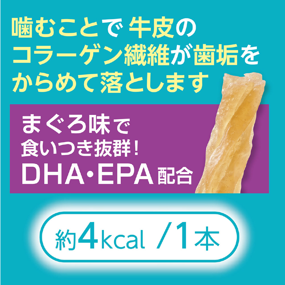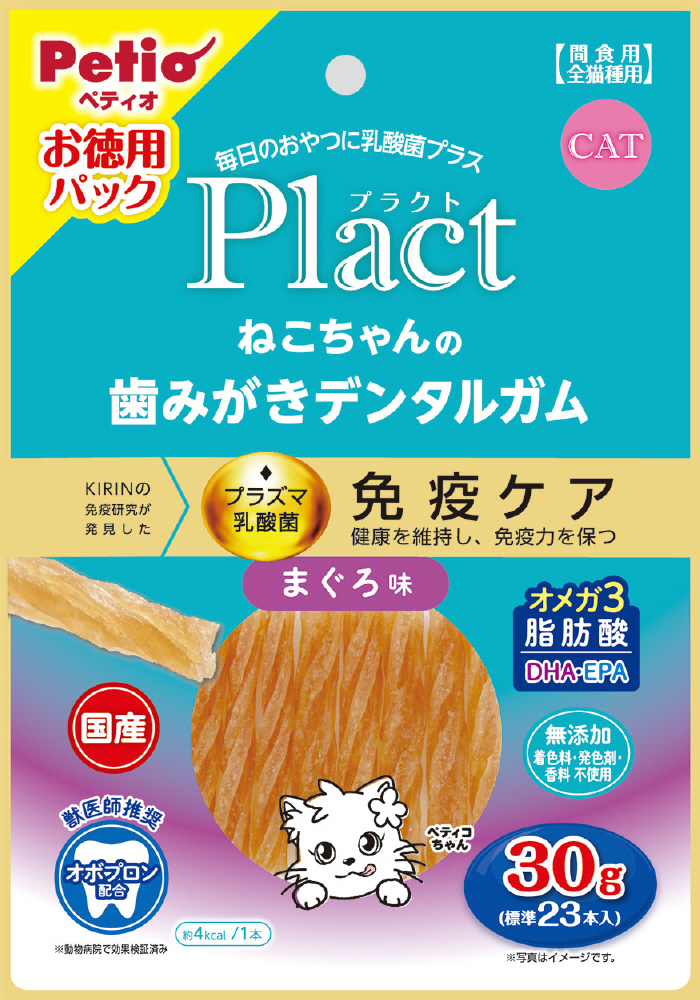 KIRINの免疫研究が発見した「プラズマ乳酸菌」を配合■詳細説明・Plactはペットの健康を考えて乳酸菌をプラスしたブランドです。・噛むことで牛皮のコラーゲン繊維が歯垢をからめて落とします。・まぐろ味で食いつき抜群!・グレインフリーだからネコちゃんの健康サポート・食物アレルギーケアができる。・着色料・発色剤・香料無添加。・お徳用パック。■原材料肉類(鶏ササミ・鶏レバー)、牛皮、馬鈴薯でんぷん、まぐろエキス、植物性油脂、魚油(DHA・EPA含有)、酵母エキス、殺菌乳酸菌(プラズマ乳酸菌)、卵黄粉末(オボプロン含有)、グリセリン、加工でんぷん、増粘安定剤(グァーガム)、酸化防止剤(亜硫酸Na・V.E)■保証成分たん白質49.5%以上、脂質1.0%以上、粗繊維0.5%以下、灰分4.5%以下、水分31.0%以下■エネルギー338kcal/100g■賞味期限365日
