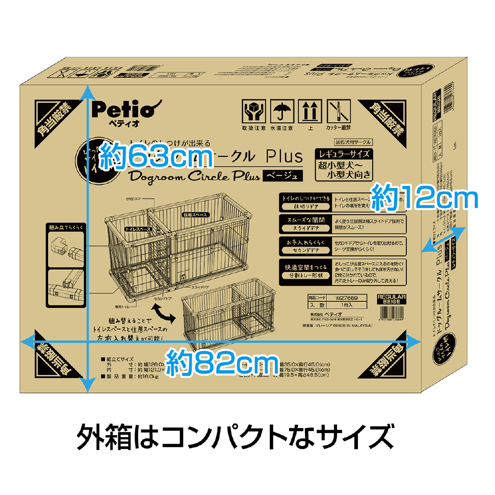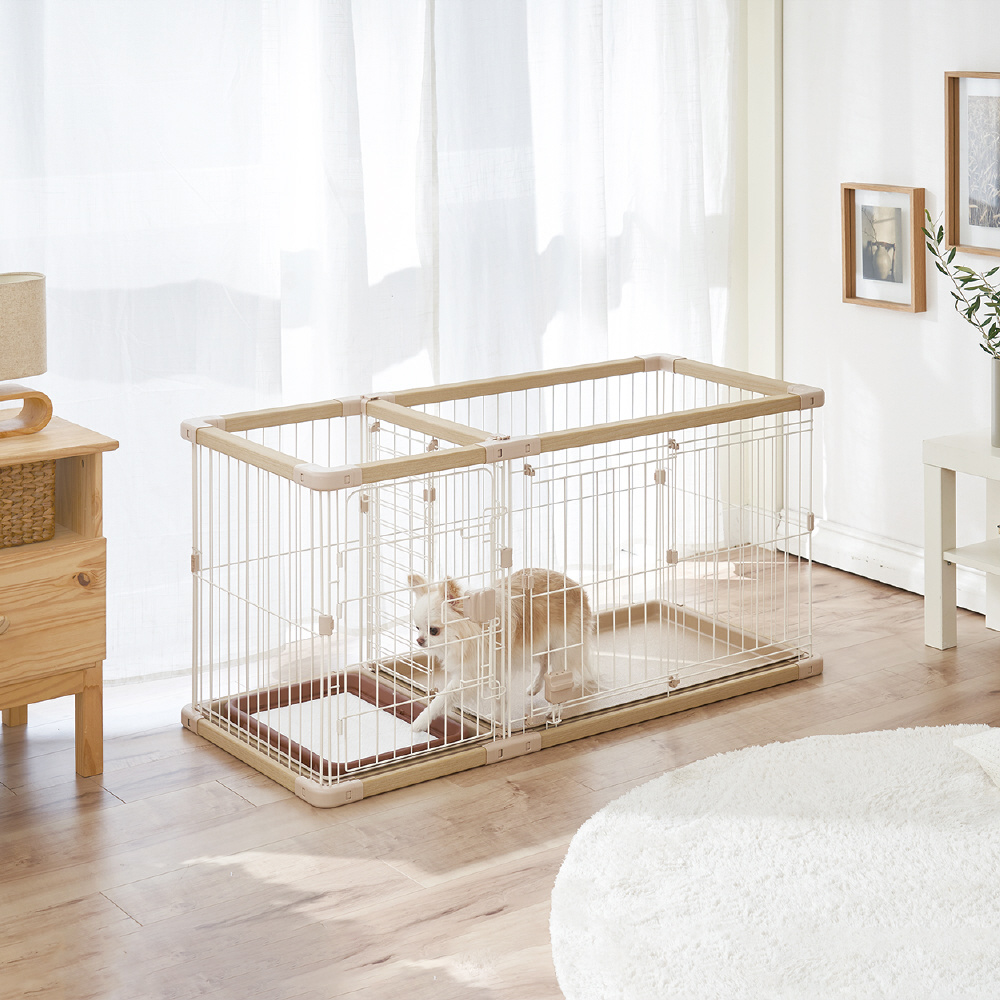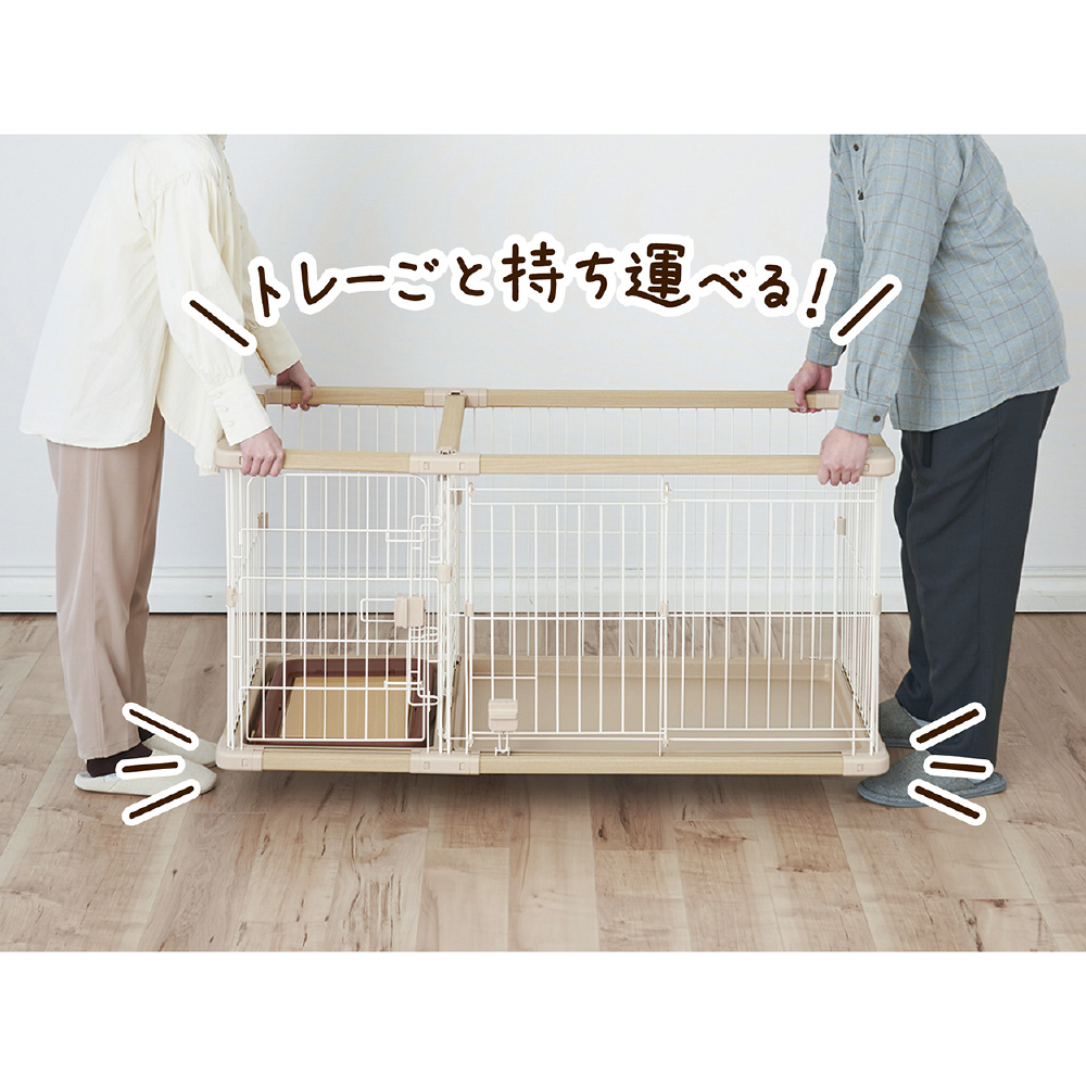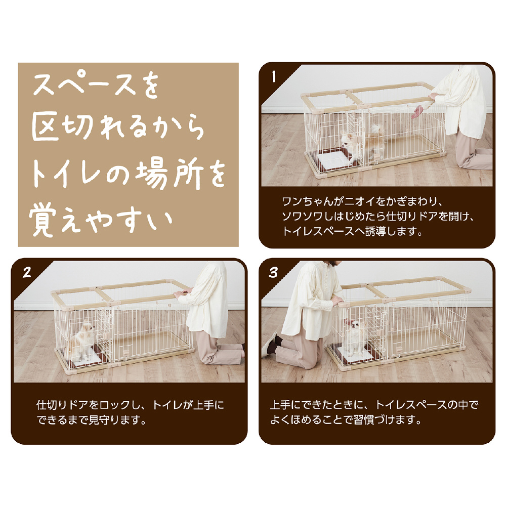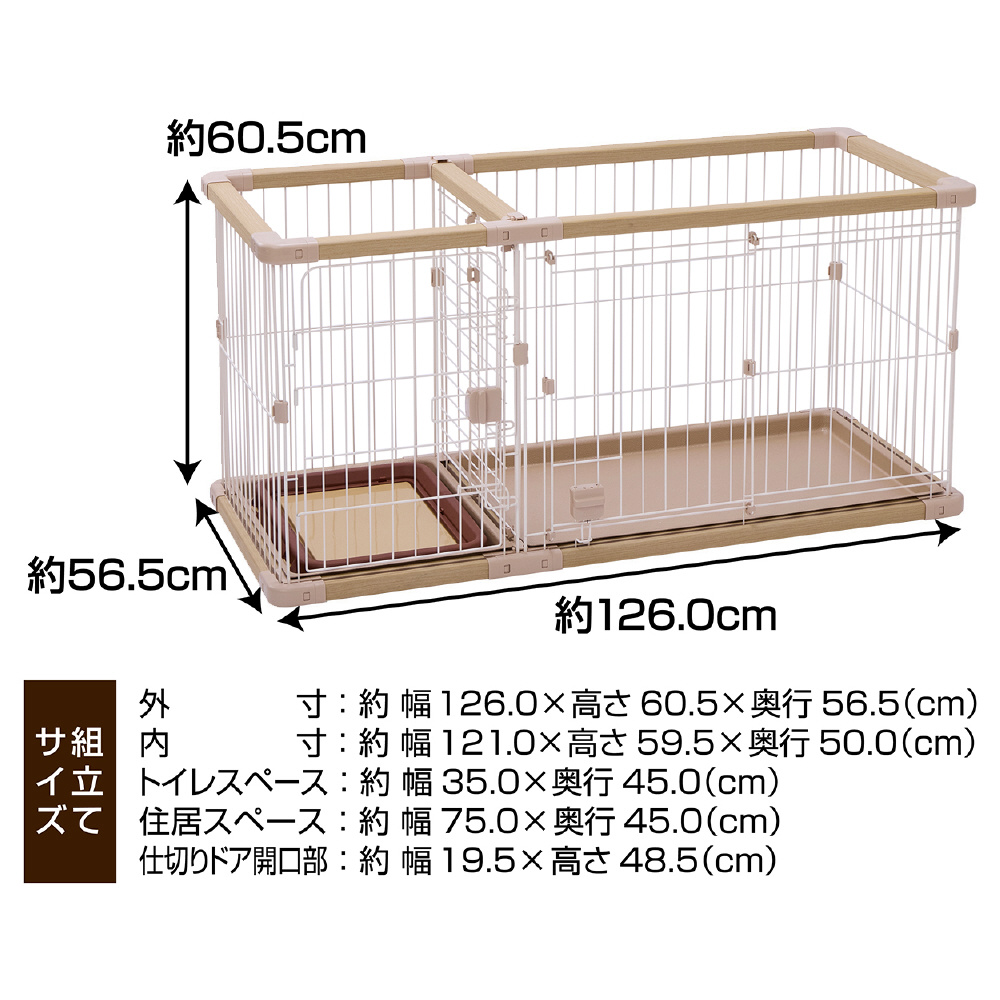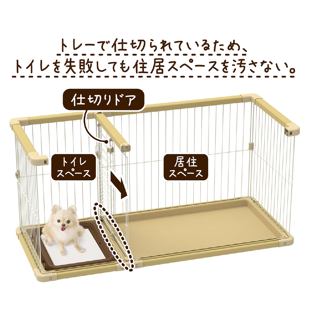 工具不要で組み立て・組み直しが簡単■詳細説明トイレと住居スペースを区切れるから、トイレの場所を覚えやすい!住居側は横スライドドアで開閉がスムーズ。トイレ側はドアが大きく開き、ワンちゃんの出入りやシーツ交換もラクラク!■●材質フェンス/鉄、フレーム/塩化ビニル樹脂・もみ殻、トレー/ABS樹脂、プラスチックパーツ/ABS樹脂・ポリプロピレン■●商品サイズ外寸/約幅126.0×高さ60.5×奥行56.5cm、内寸/約幅121.0×高さ59.5×奥行50.0cm、住居スペース/約幅75.0×奥行45.0cm、トイレスペース/約幅35.0×奥行45.0cm、仕切りドア開口部/約幅19.5×高さ48.5cm、スライドドア入口/約幅35.0×高さ47.0cm、セカンドドア入口/約幅34.0×高さ53.5cm■●適応種超小型犬〜小型犬