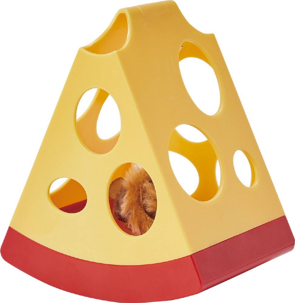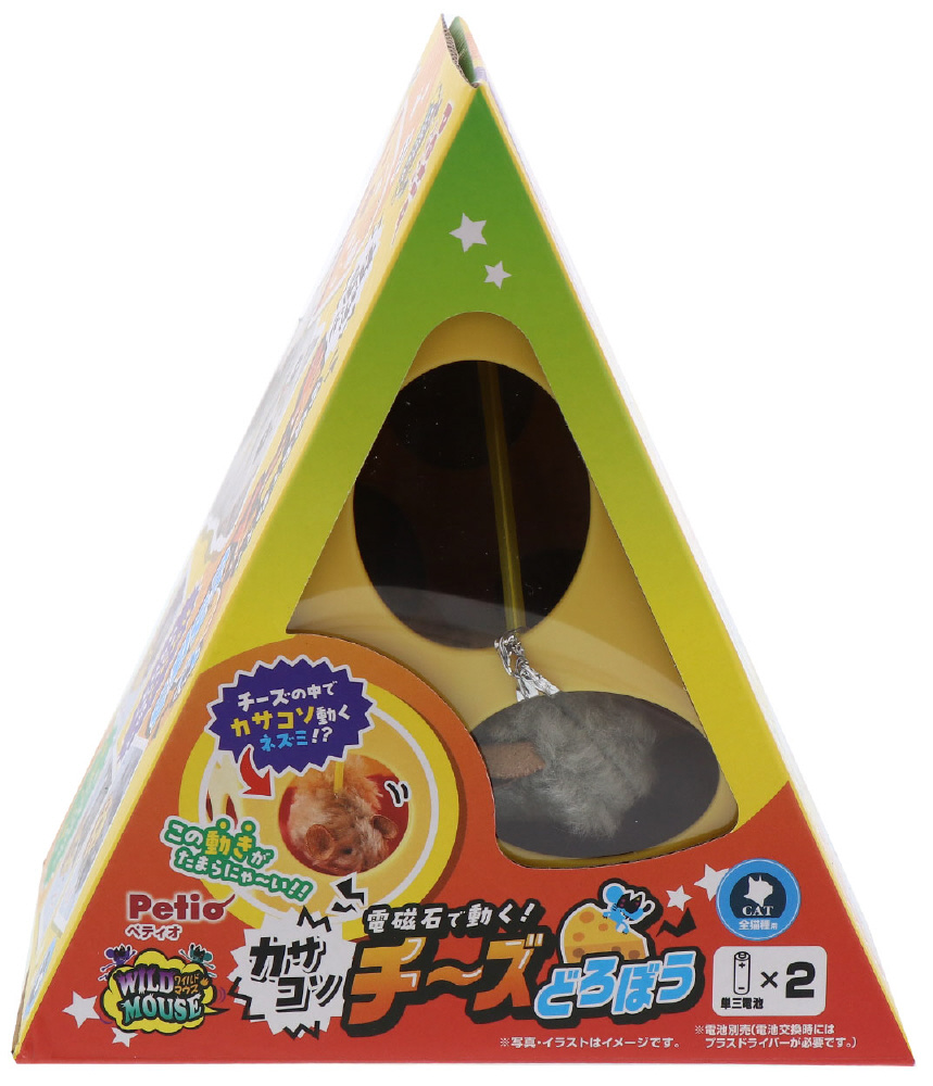 カサコソ動いてネコちゃんワクワク!■詳細説明本体裏にあるスイッチをONにすると、チーズの中のネズミが電磁石の力でゆらゆらとネコちゃんを誘います。チーズの穴からネズミを狙って退治しよう!■●材質本体/ABS樹脂、ネズミ/ポリエステル・磁石・鳥毛■●商品サイズW13×H15.5×D10.5cm