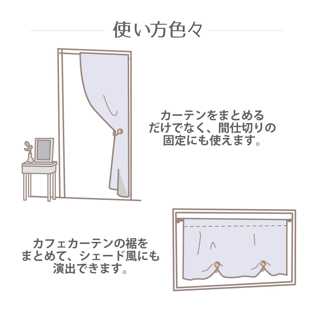単にカーテンをまとめる時だけでなく、少し開けたいとき等にも使用可能。さらには洗面台のタオルのホルダーとしてもご使用いただけます。