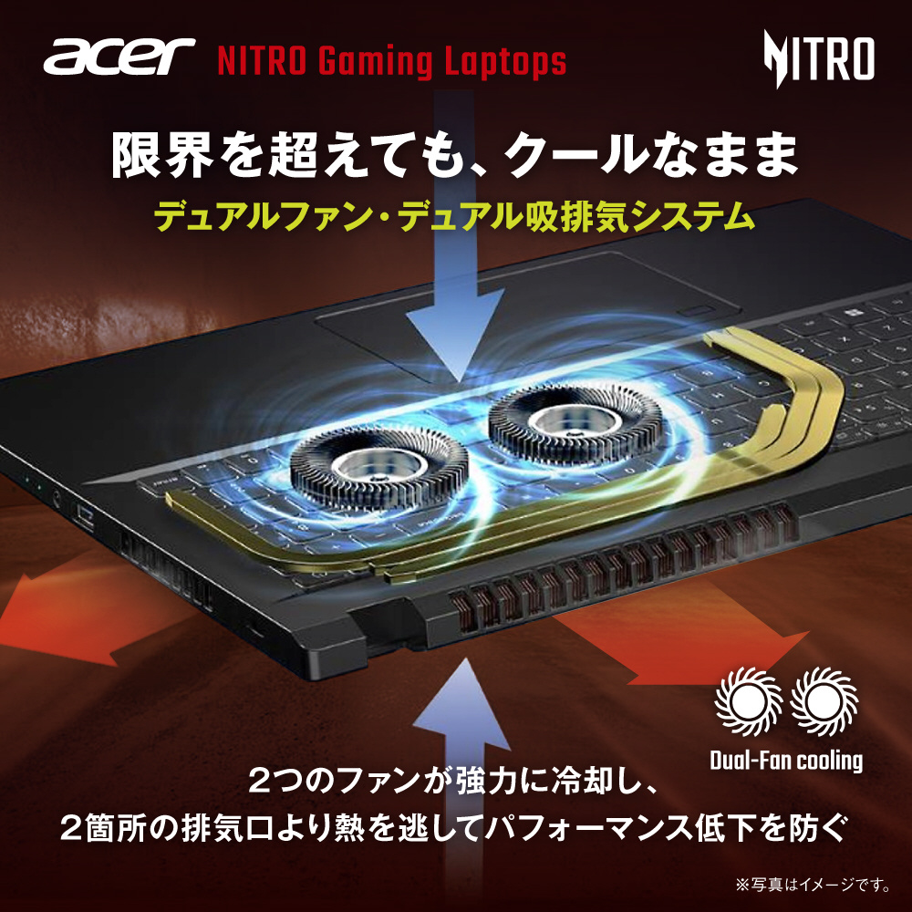 高負荷なゲームプレイでも、冷静さを失わない。それがAcer Nitro V 15の真骨頂。最新のサーマル設計により、デュアルファンとデュアル吸排気システムによる冷却性能が大幅に向上。上部キーボード面と底面カバーの両方から取り込んだ冷気を、2つのファンが連動して強力に循環させ、側面および背面の排気口から効率的に熱を排出します。