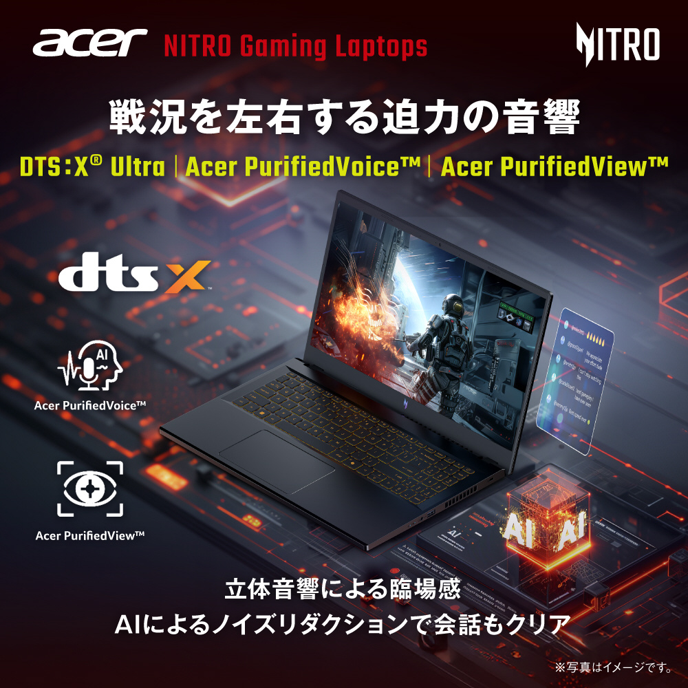 DTS:X Ultraによる立体音響が、敵の気配を捉え、ゲームの世界を隅々までリアルに再現。足音、銃声、環境音が空間的に広がり、瞬時の判断力を研ぎ澄ませます。さらに、Acer PurifiedVoice のAIノイズリダクション機能が、あなたの声をクリアに届け、仲間からの声もクリアに昇華。戦術的なコミュニケーションを妨げません。