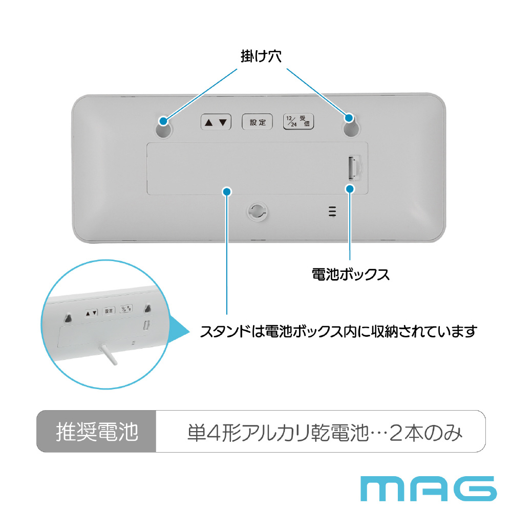 仕様2 温度/湿度表示、12/24時間表示切替、電池交換お知らせ表示、置掛兼用