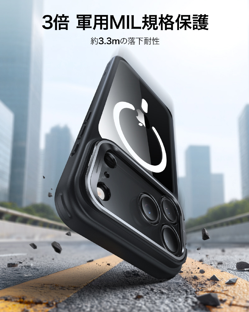 iPhone 17 Pro Max(6.9インチ)MagSafe対応、隠れスタンド付き、ミリタリーグレードケース クリアブラック 1A86800301-Clear Black
