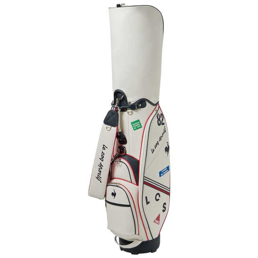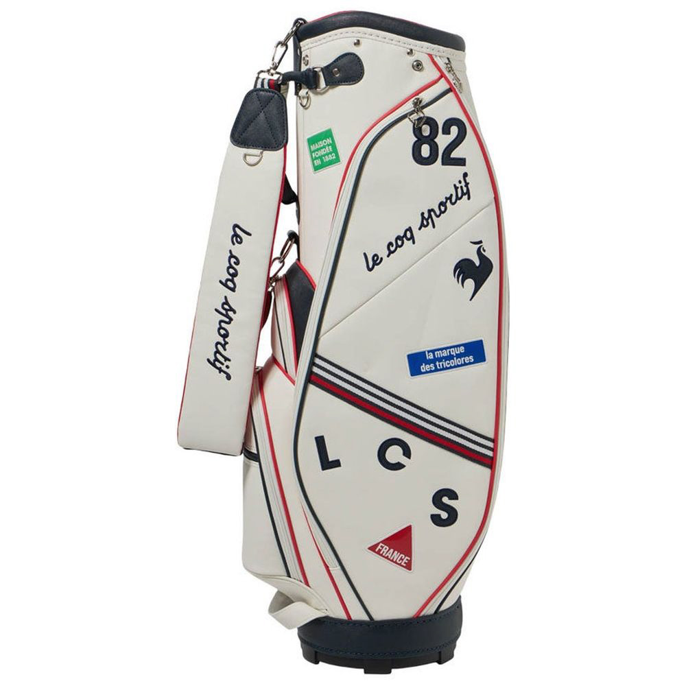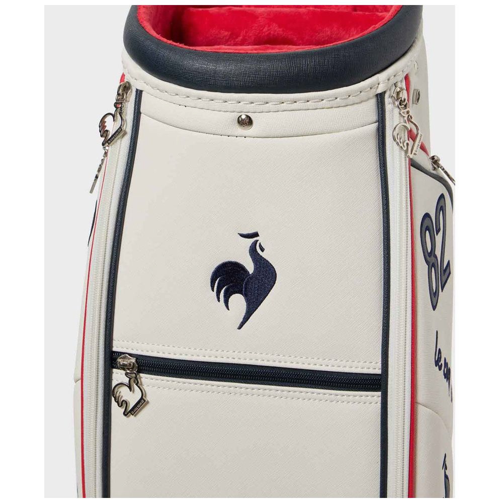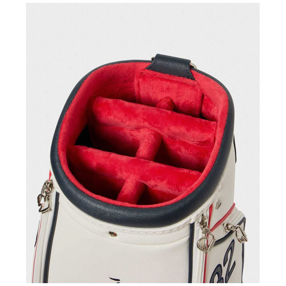 しぼ感のある合皮にアップリケや、ライン、ブランドロゴなどを落とし込んだ高級感のあるキャディバッグです。