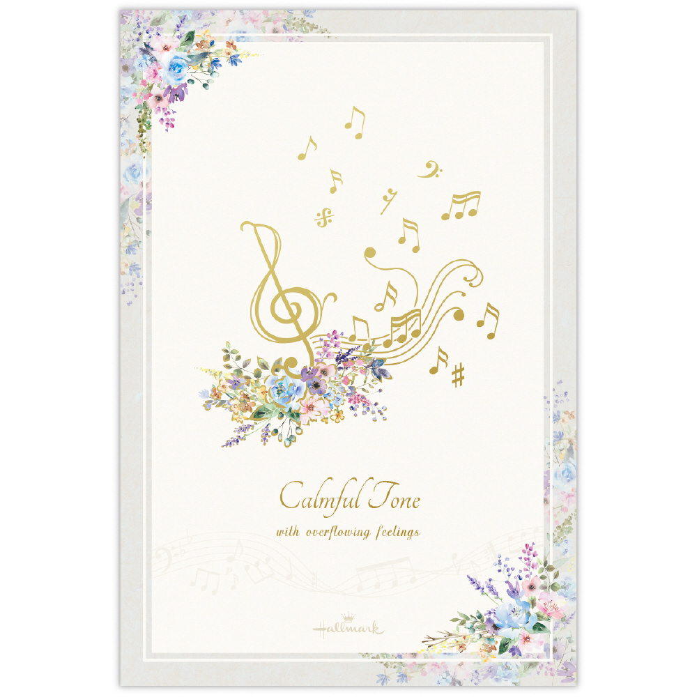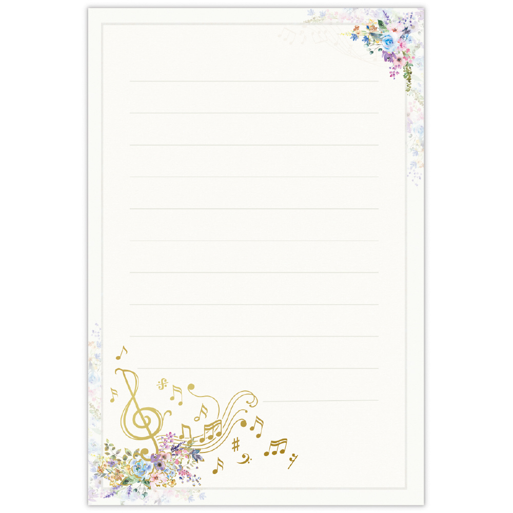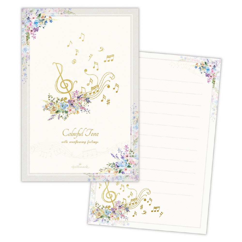 秋から冬にかけて使いやすい落ち着いたトーンのレターコレクション「コンフォート&ピース」。人気の花×音楽柄を、落ち着いたグレイッシュトーンで新鮮な見た目に。特定の楽器ではなく五線譜と音符のモチーフを描くことで、幅広い音楽好きの方に楽しんでいただけるようにしました。マットタイプの金箔加工がシックで繊細な印象を与えます。