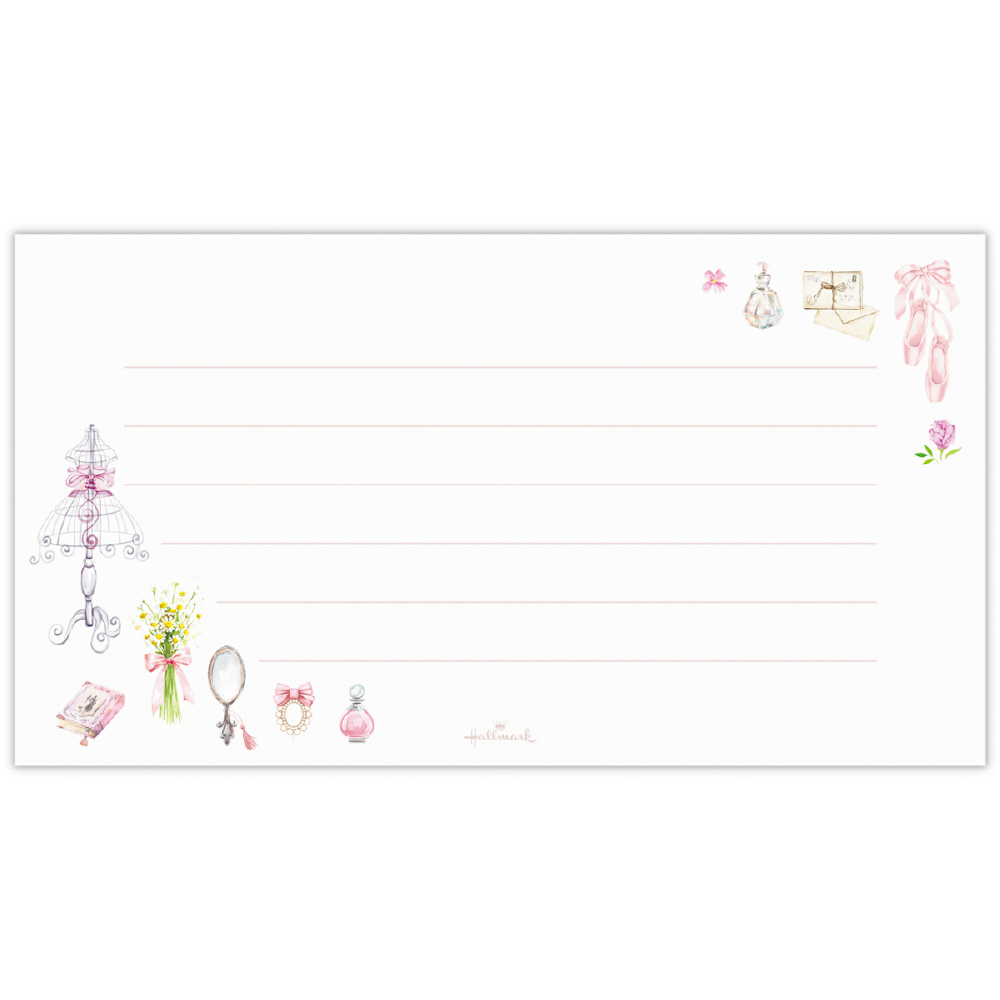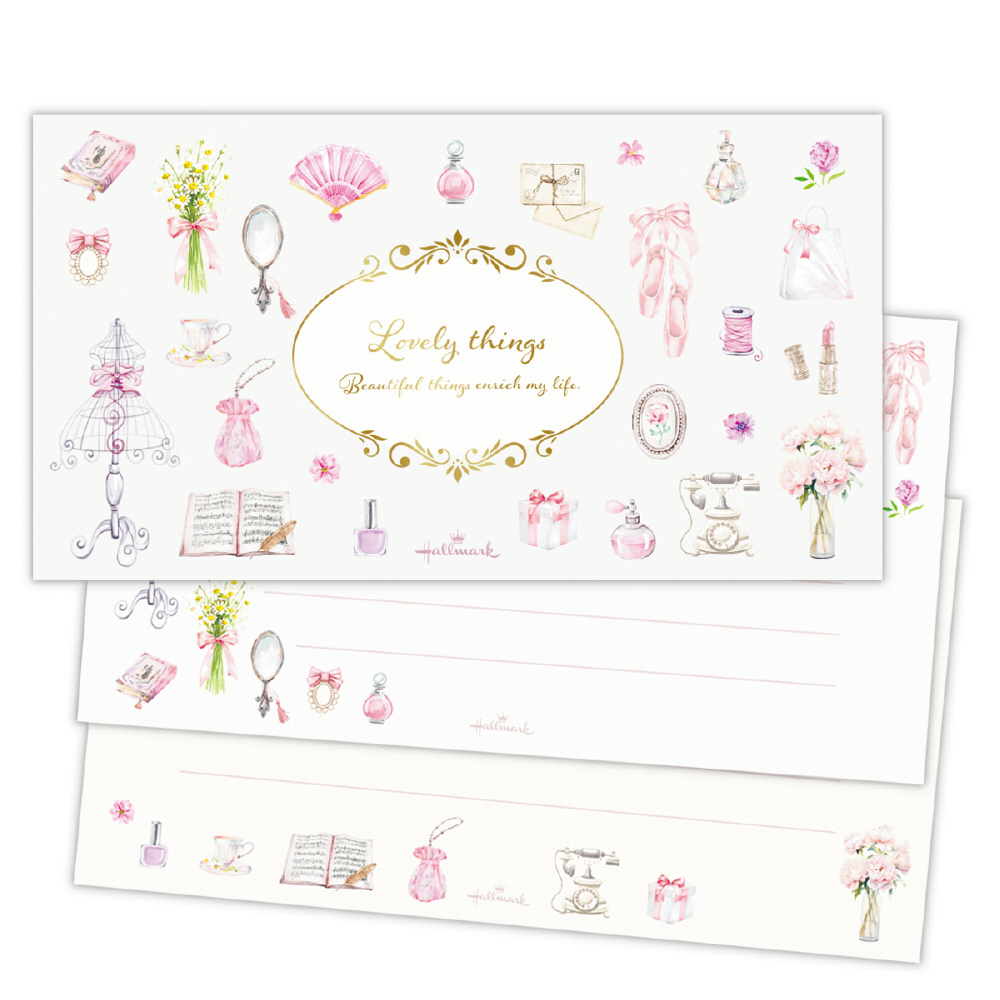 バレエシューズやアンティークのティーカップ、香水瓶、ブーケなど、心ときめく小物たちを集めました。甘くなりすぎないグレイッシュなピンクを使い、大人も使いやすいフェミニンなデザインに仕上げています。