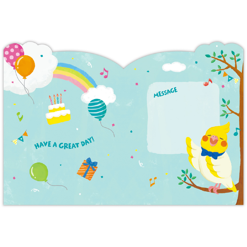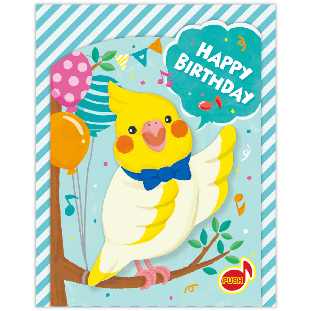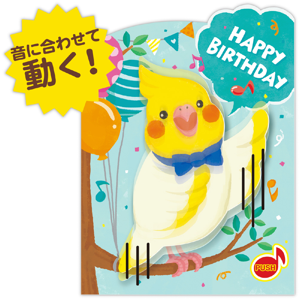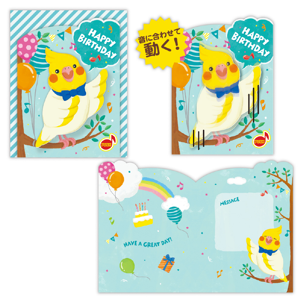 音楽に合わせて動くオルゴールカード! バースデーソングに合わせてオカメインコがぴょこぴょこ動きながら誕生日をお祝いしてくれます。