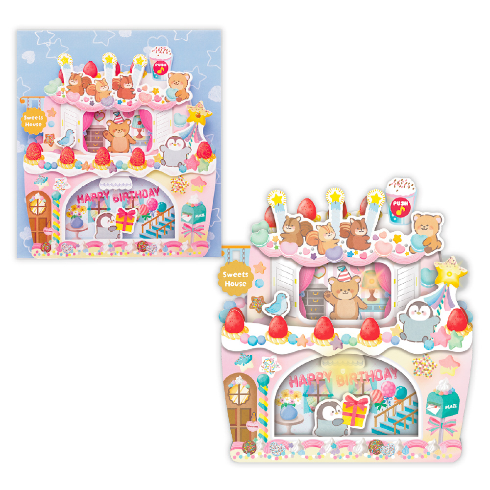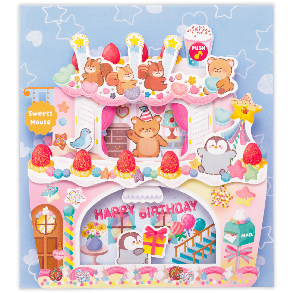 ペンギン、くま、リスなど動物たちが住むキュートなケーキのおうちを表現したオルゴールカード。動物たちのお祝いボイスに加え、LEDライトが光って特別感たっぷり。