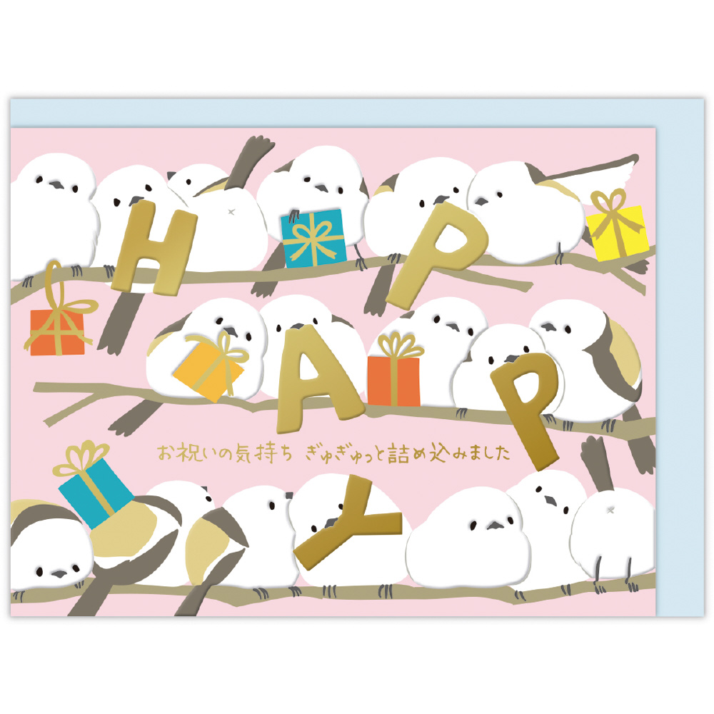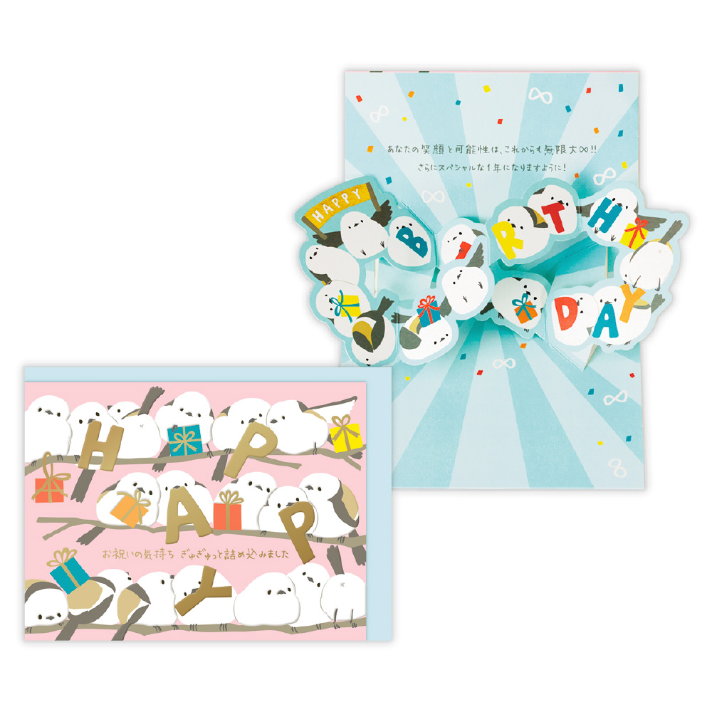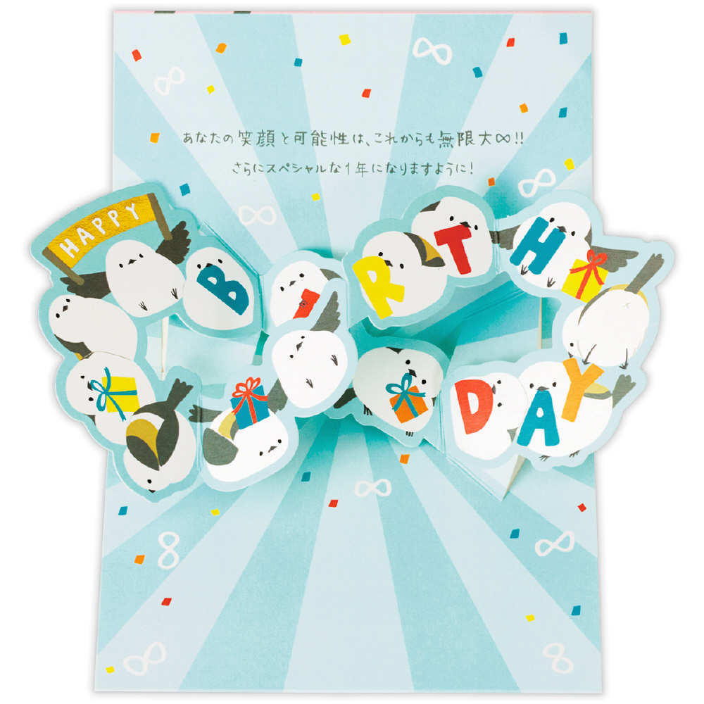 「あなたの笑顔と可能性は、これからも無限大∞!!」 カードを開くと「∞」(無限大)の形になったシマエナガがポップアップするインパクトあるバースデーカードです。