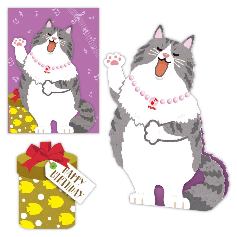 可愛い動物やキャラクターが自慢の歌声で誕生日をお祝いしてくれる「熱唱系アニマルズ」シリーズ。オペラ歌手をイメージしたゴージャスな長毛種の猫が、自慢の美声でバースデーソングを歌い上げます。