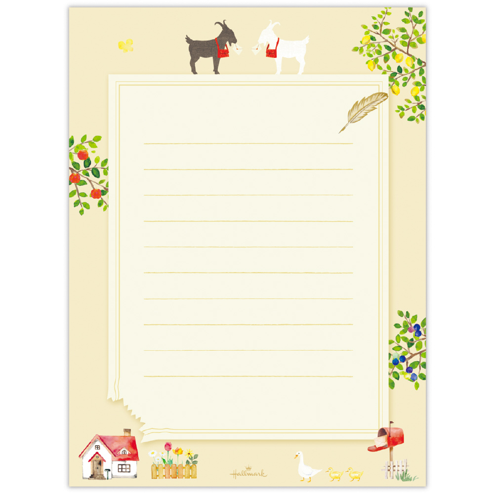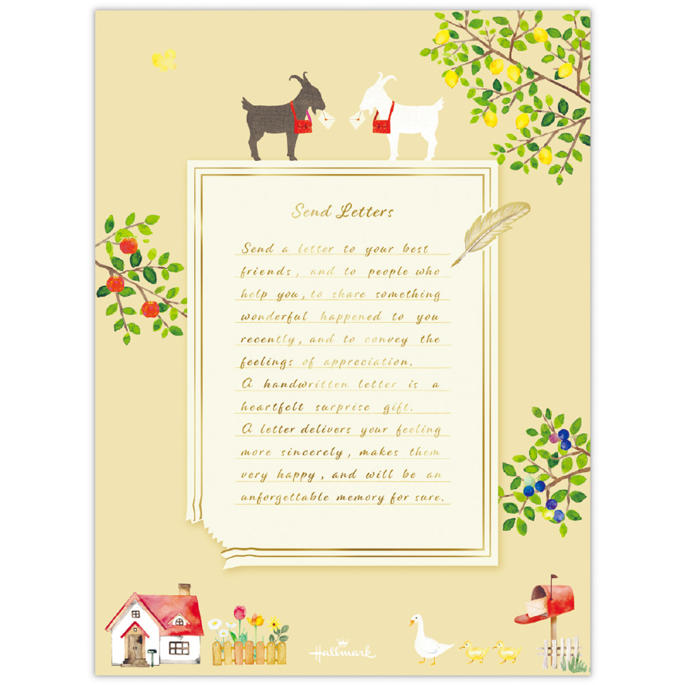 お手紙を書くシーンと親和性の高い童謡「やぎさんゆうびん」の世界観をテーマに、海外の絵本の装丁をイメージしてデザインしました。お手紙の左下がヤギにかじられたようになっているあしらいがチャームポイントです。