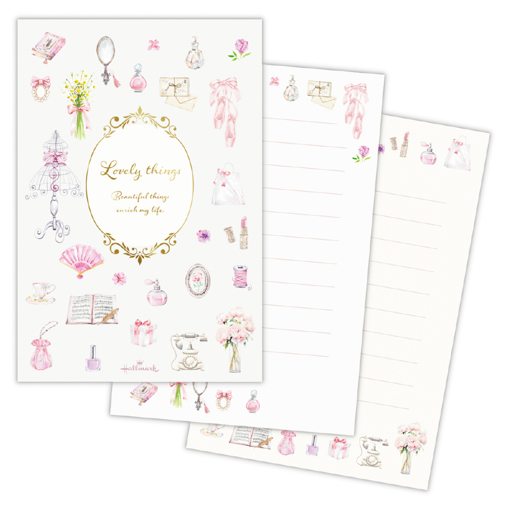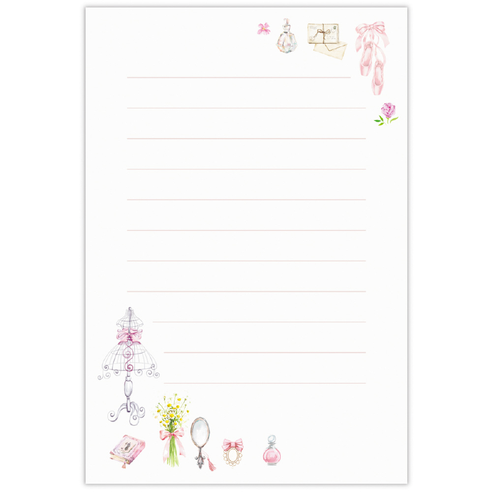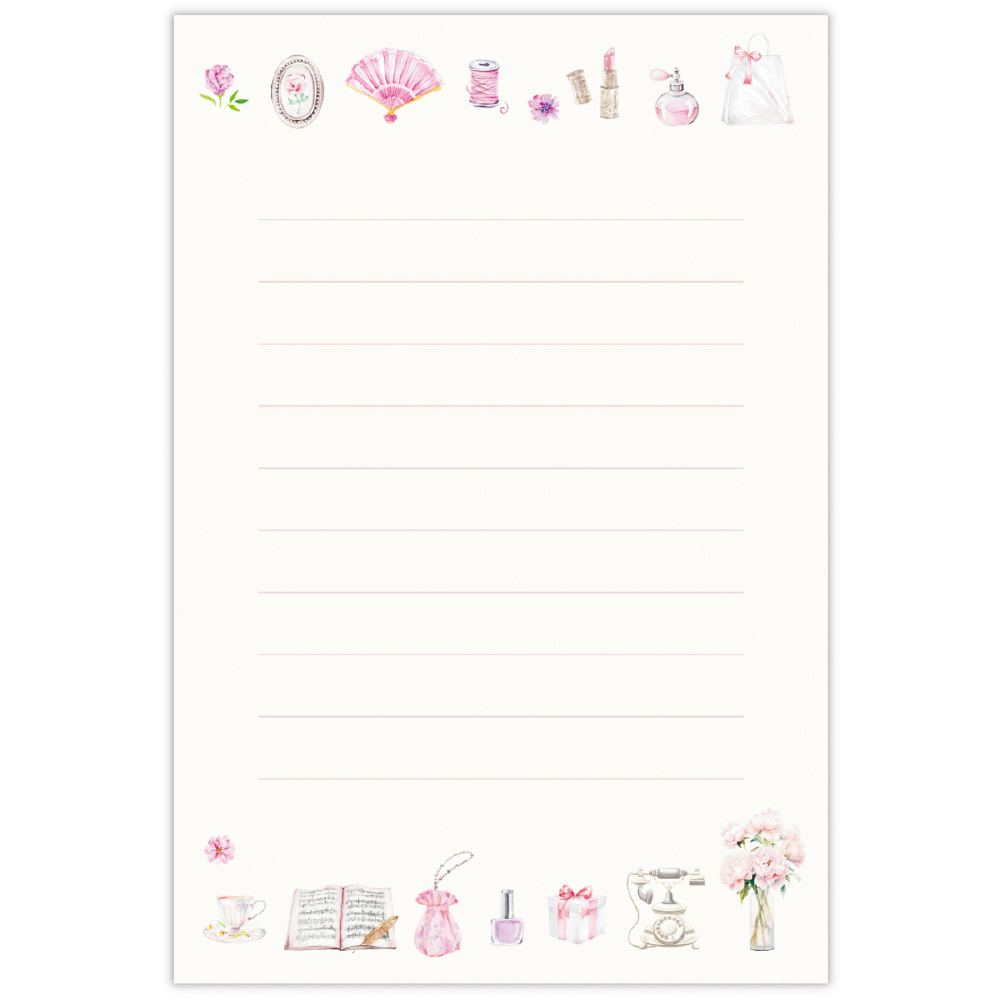 バレエシューズやアンティークのティーカップ、香水瓶、ブーケなど、心ときめく小物たちを集めました。甘くなりすぎないグレイッシュなピンクを使い、大人も使いやすいフェミニンなデザインに仕上げています。