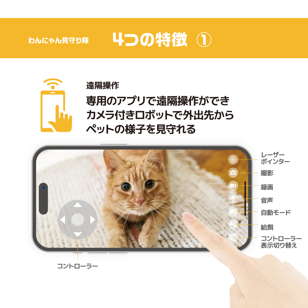 専用無料アプリをダウンロードすれば、スマホで自宅のわんにゃん見守り隊を遠隔操作できます。
