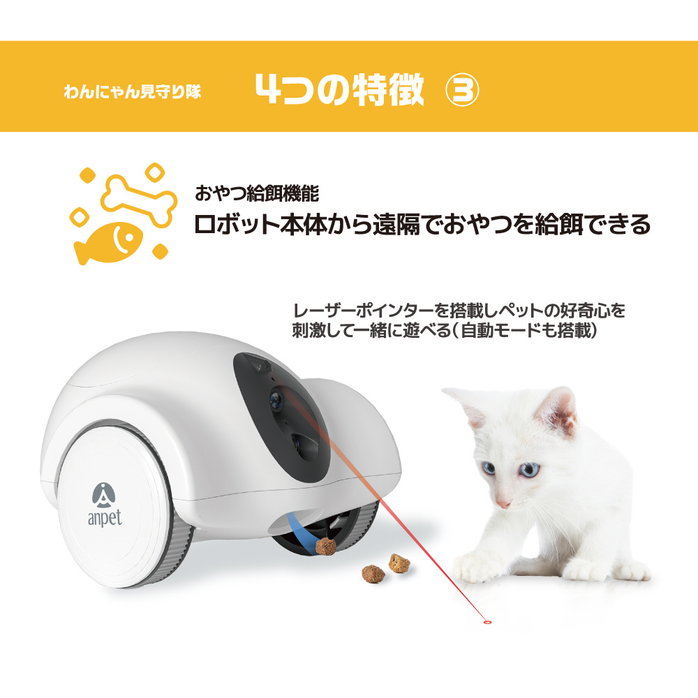 ペットカメラの前部からレーザーポインターを照射でき、ペットカメラは、マイクとスピーカー搭載で留守番中のペットとコミュニケーションがとれます。