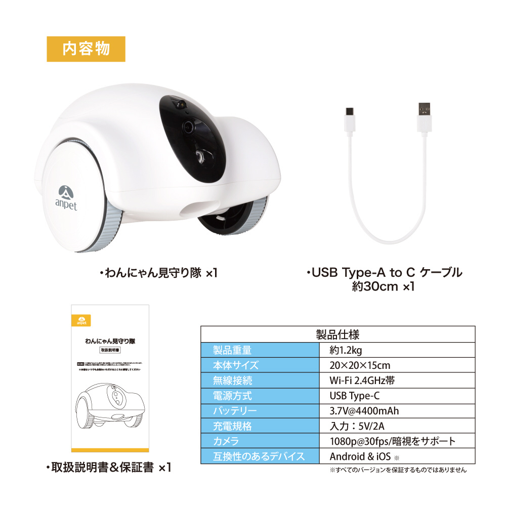 無線接続/Wi-fi2.4GHz帯、充電方式/USB Type-C、充電規格/入力5v-2A、バッテリー/3.7v@4400mAh、カメラ/1080p@30fps/暗視カメラサポート、換性のあるデバイス/Android&ios対応(※すべてのバージョンを保証するものではありません。)