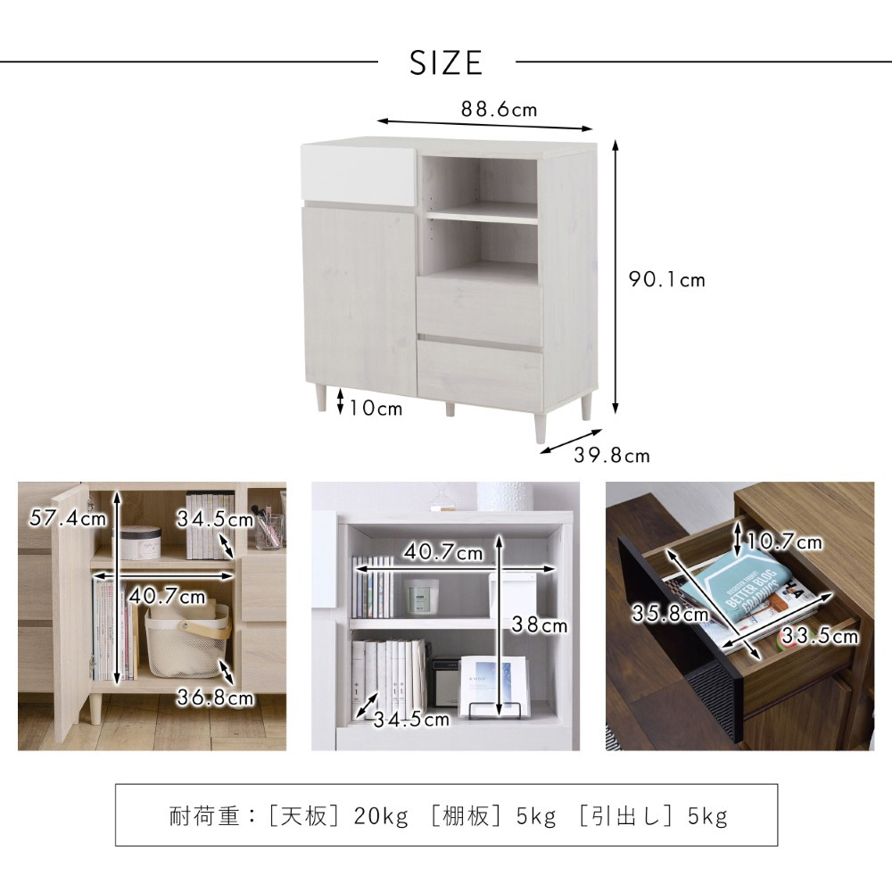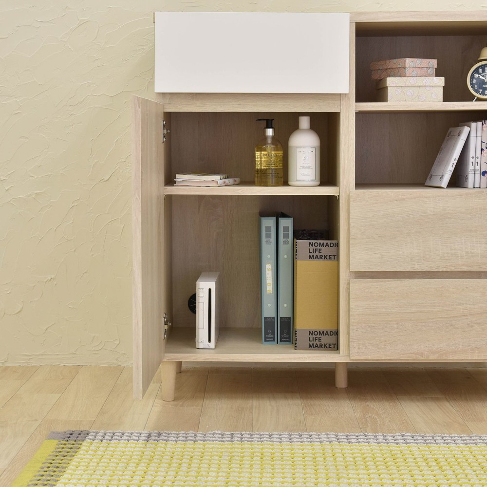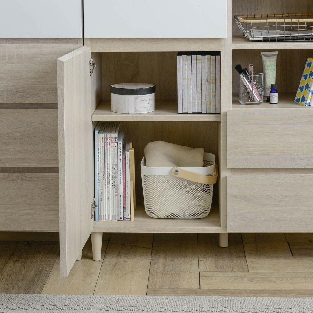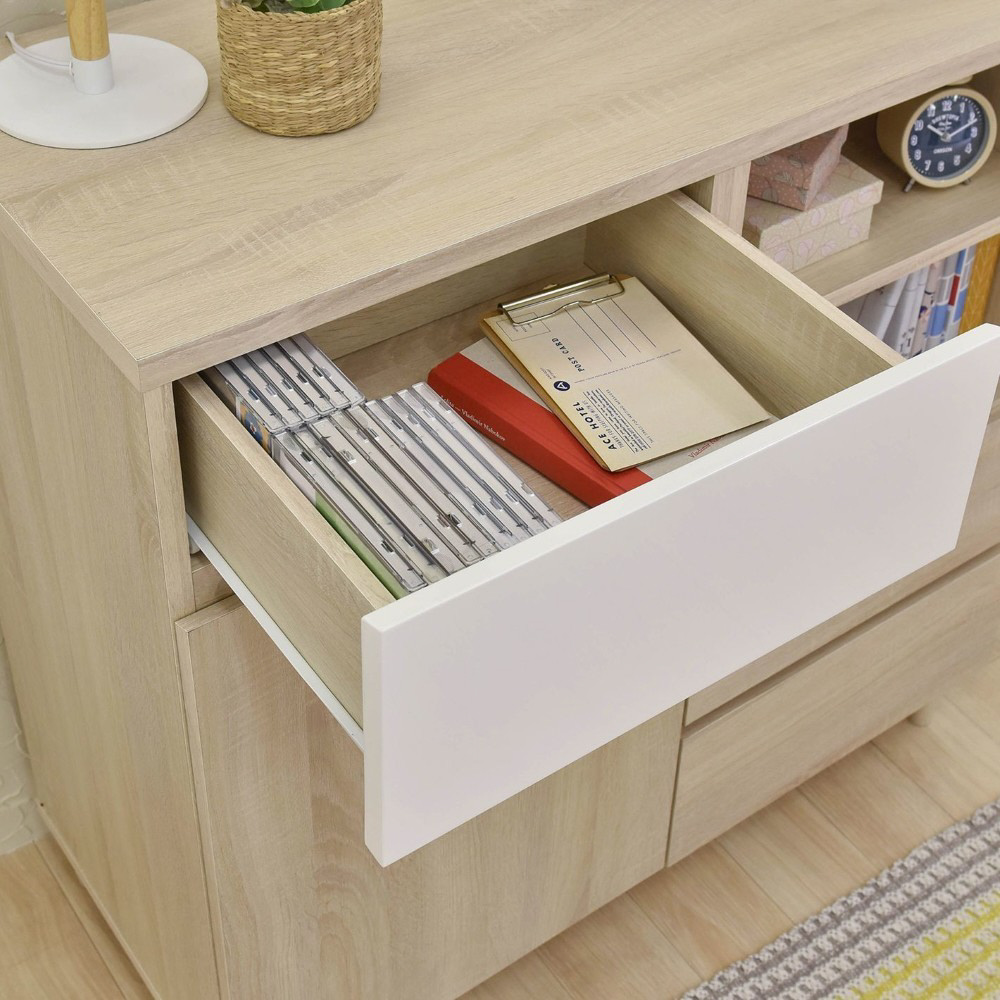 A4サイズが入る引出しや可動棚付きのオープン収納と扉付き収納が付いており、本や雑誌、紙類・文房具などを整理して収納できます。