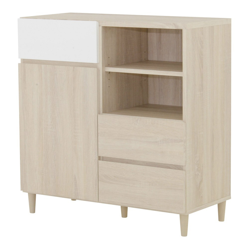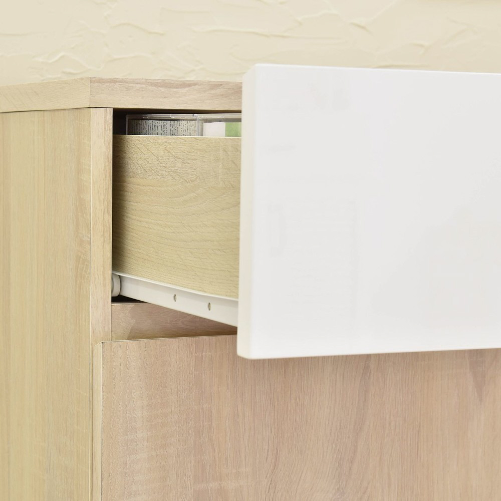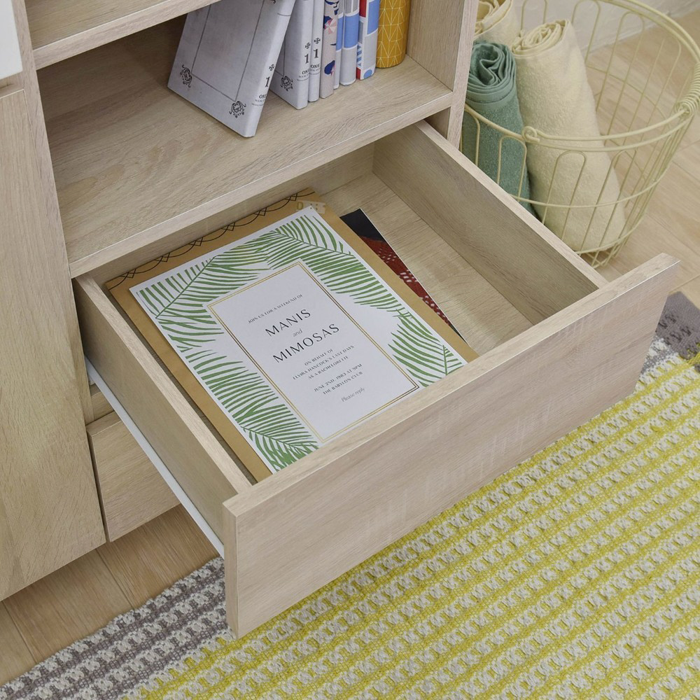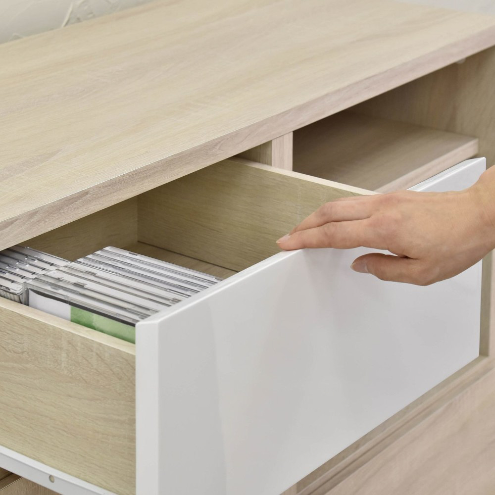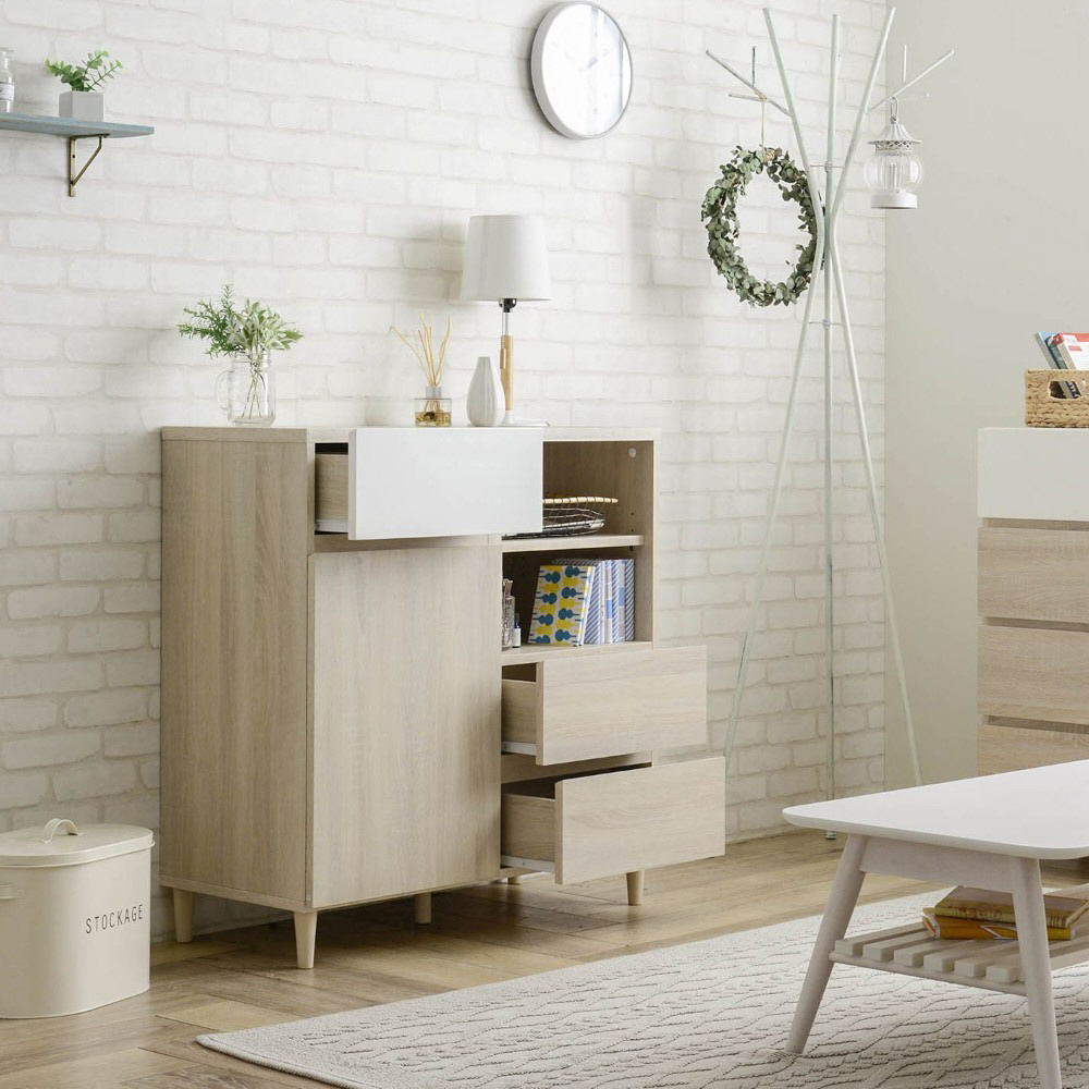 A4サイズが入る引出しや可動棚付きのオープン収納と扉付き収納が付いており、本や雑誌、紙類・文房具などを整理して収納できます。