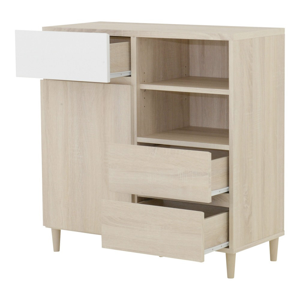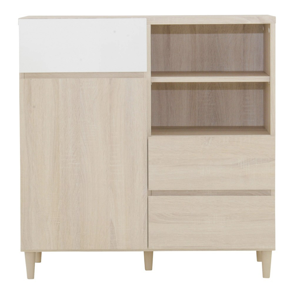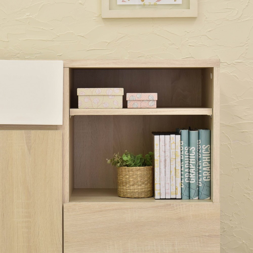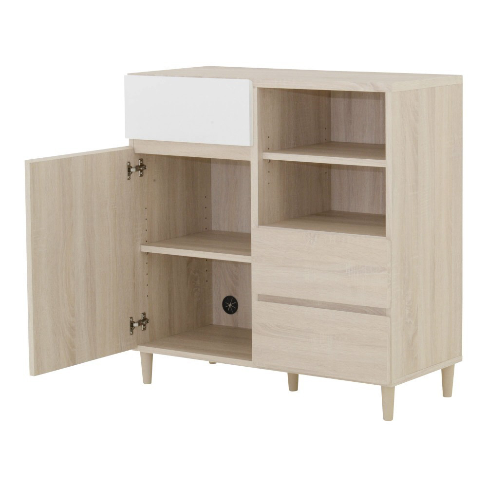 A4サイズが入る引出しや可動棚付きのオープン収納と扉付き収納が付いており、本や雑誌、紙類・文房具などを整理して収納できます。