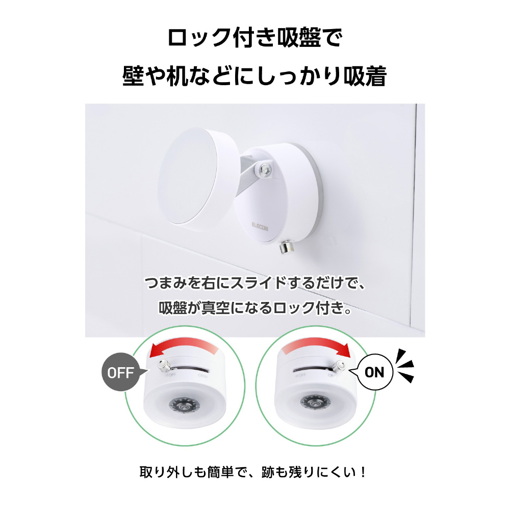 壁や机などに吸盤でしっかり吸着可能。つまみを右にスライドするだけで、吸盤が真空になるロック付きです。
