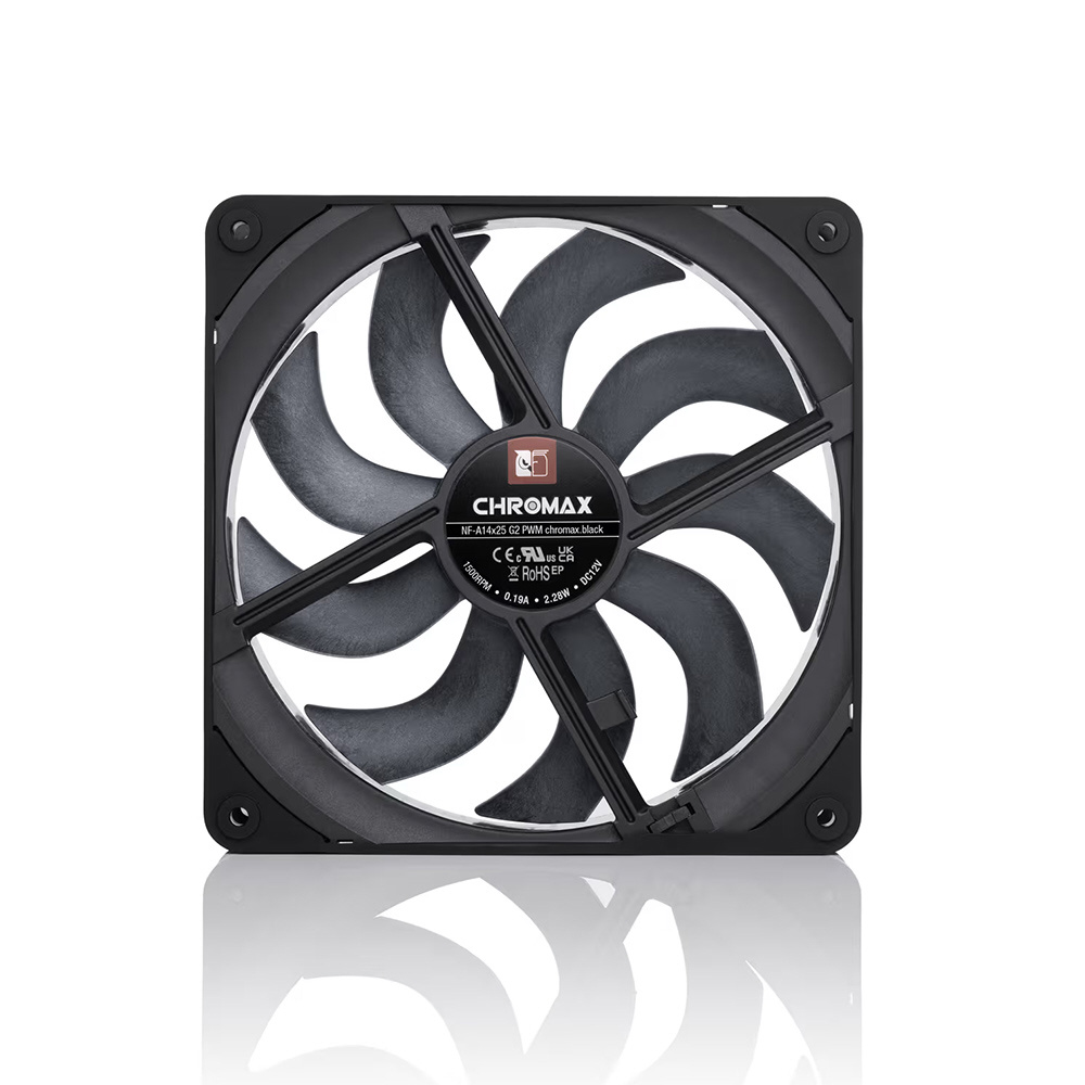 ■chromax.black エディションは、NF-A14x25 G2が採用するSterrox液晶ポリマー製インペラ、充実した機能群、そして画期的な高効率・静音冷却性能を、洗練されたブラックデザインに融合しています。