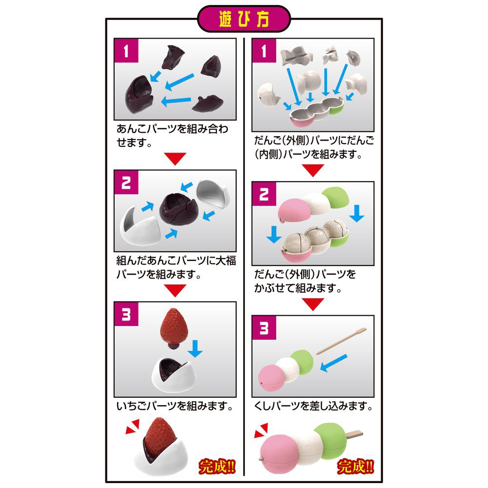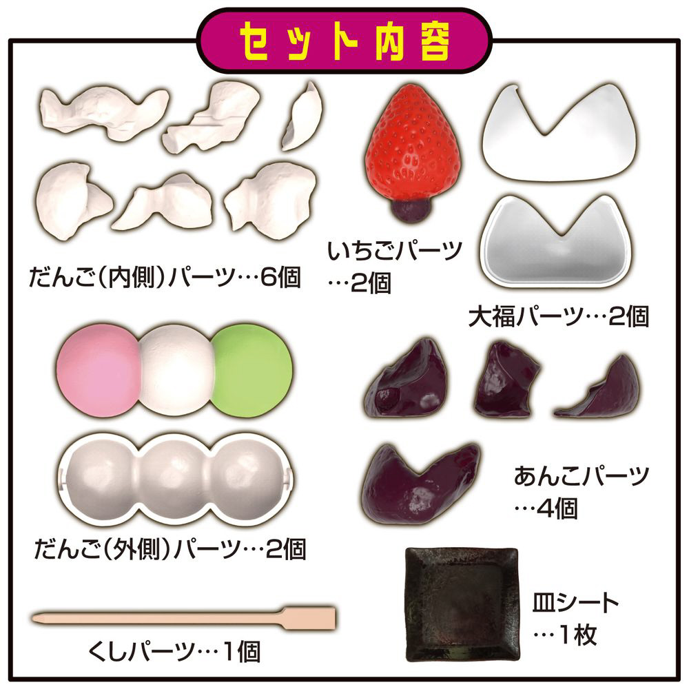 最後に串パーツで差すと「三色だんご」が完成し、4個あんこパーツから正しい組み合わせを選び、大福パーツでつつみ、