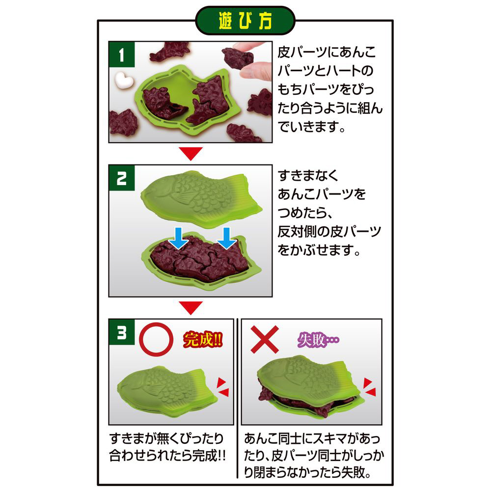 立体的な8つのあんこパーツの形状をよく見つつ、たい焼き型のケースにぴったり収まるようパズルします。